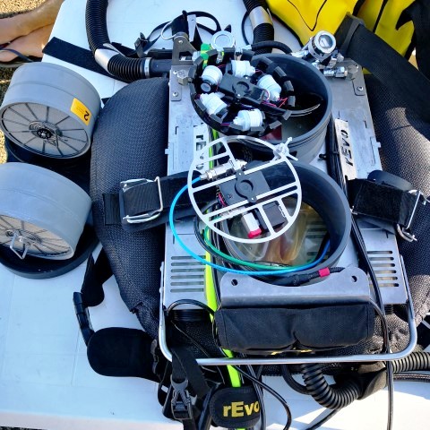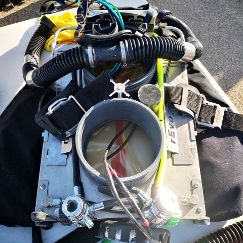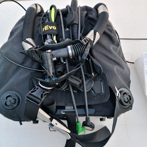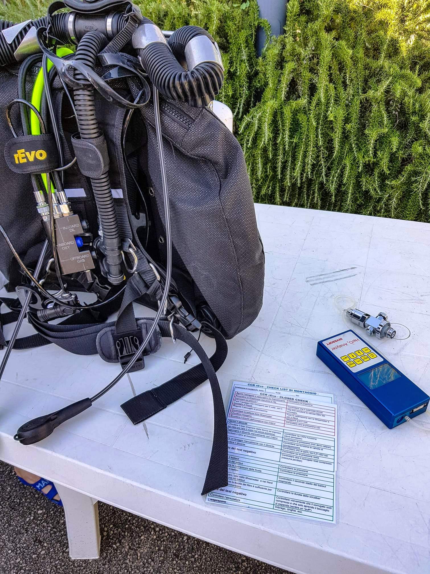 macchina utilizzata Tutti i corsi per l’impiego del rebreather abilitano all’utilizzo di una specifica macchina. Io ho scelto il "rEvo III hCCR" una macchina molto sicura e performante. L’ho scelta per la sua leggerezza, ma soprattutto perché mia moglie Angela la possiede già da un anno e in futuro per noi sarà più facile immergersi assieme utilizzando la stessa macchina.