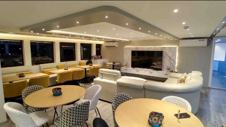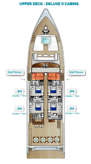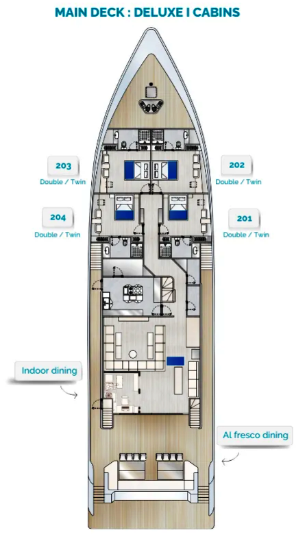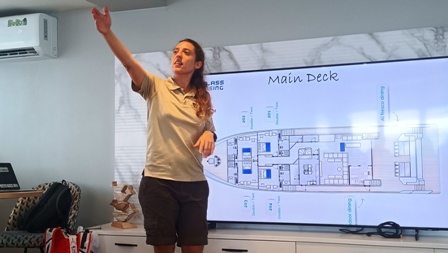 E adesso due parole sulla nostra bellissima barca, il m/y "Princess Maani". Si tratta del nuovissimo yacht, fiore all’occhiello della "Top Class Cruising", varato nell’ottobre 2024. Lungo 41 metri, lo yacht è ricco di spazi e caratteristiche confortevoli, come le due vasche idromassaggio Jacuzzi sul ponte superiore, la grande terrazza solarium, il fornitissimo cocktail bar, il ristorante a buffet e la possibilità di pranzare all’aperto. La "Princess Maani" è spaziosissima: ha soltanto 14 cabine disposte su tre ponti, pulitissime, grandi e confortevoli, con bagno privato e un’ampia doccia. Io e mia moglie abbiamo scelto una cabina deluxe, una vera e propria suite molto ampia con grandi vetrate, situata sul ponte principale allo stesso livello del ristorante. Ci hanno assegnato la cabina 303, che si affaccia sul lato di sinistra della barca. In cabina c'è un grande letto matrimoniale e un bel bagno con doccia con le pareti di marmo, ed è tutto praticamente nuovo. Praticamente la nostra sarà una crociera a bordo di un albergo galleggiante a 5 stelle!