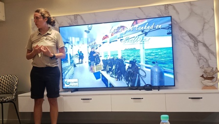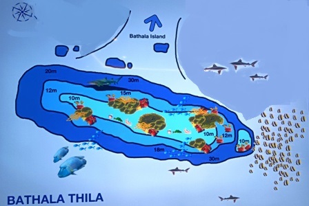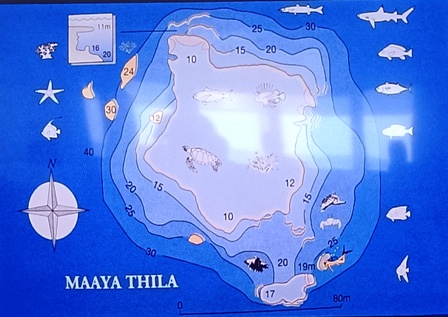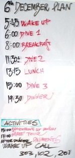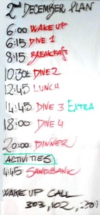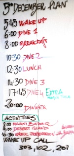 Il programma giornaliero a bordo si svolge secondo una routine molto precisa, scandita dal suono di una campanella che annuncia i briefing delle immersioni, e prevede 3 tuffi al giorno, compresa un’immersione notturna durante la settimana. La prima immersione avviene la mattina presto verso le 06:00, quando il sole sorge all’improvviso. Ci si sveglia e si ha appena il tempo di mangiare qualche biscotto e bere un tè o un caffè, poi c’e subito il briefing (in inglese e in italiano) con la mappa dettagliata del punto d’immersione proiettata su un megaschermo. Dopo il briefing si sale sul dhoni e si raggiunge il punto d’immersione che è sempre poco distante dalla barca. Terminata la prima immersione della giornata viene servita la colazione completa e ricca: uova come preferisci, marmellate, crema di nocciole, miele, pancakes, torte, yogurt, frutta e verdura tropicale appena tagliata, succhi di frutta. |