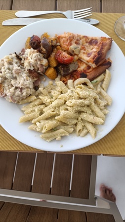 La cucina a bordo è ricca e variegata, propone piatti europei o sapori asiatici, anche con opzioni vegetariane ed influenzata dalla posizione geografica e dalla cultura islamica delle Maldive. La cucina maldiviana è caratterizzata da un uso abbondante di pesce, cocco e spezie, riflettendo l’abbondanza di risorse naturali dell’arcipelago, ma la presenza a bordo di un cuoco italiano ci ha garantito ogni giorno anche la presenza della pastasciutta (fondamentale per noi italiani). La colazione era di tipo continentale, con uova, toast, marmellate, pancake, frutta, tè e succhi di frutta. A pranzo e cena invece abbiamo mangiato tanti piatti a base di pollo o di pesce accompagnati da varie salse, riso, verdure cotte e crude, frutta tropicale, pastasciutta, tranci di pizza e dolce ad ogni pranzo.
