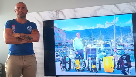 Sopra: Andrea Bada, famoso esploratore e "cacciatore di relitti", ci ha intrattenuti per un paio di sere parlandoci delle immersioni tecniche sul relitto della petroliera "Haven" al largo di Genova e delle sue immersioni più estreme alla scoperta di relitti profondi e sconosciuti. |