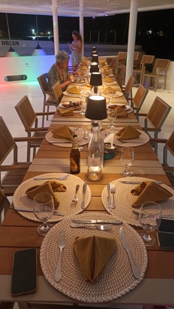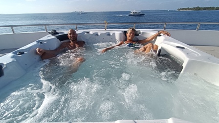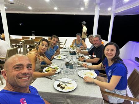 Dopo la colazione c’è il tempo per almeno un’ora di relax prima del secondo tuffo che avviene tra le 10:00 e le 11:30. Poi arriva l’ora del pranzo a buffet con ampia scelta e varietà di pietanze, sempre diverse. Dopo pranzo ci si può rilassare prendendo il sole sui lettini del sundeck, oppure immergersi nella vasca idromassaggio, prima di salire nuovamente sul dhoni per la terza immersione tra le 16:30 e le 17:30. Dopo l’ultimo tuffo della giornata e una bella doccia è il momento dell’happy hour al tramonto, seduti al bar del ponte superiore, per poi scendere a cena sul ponte principale verso le 19:30. L’organizzazione perfetta e puntuale ci ha consentito di sfruttare appieno tutte le opportunità offerte da questa bella crociera e di questo dobbiamo dare merito a Martina, a Beatrice e a tutto l’efficientissimo equipaggio. |