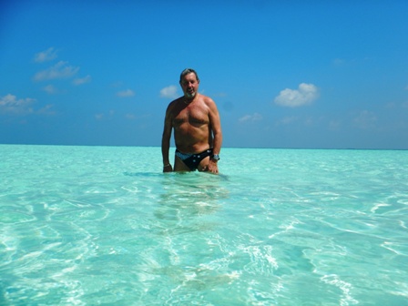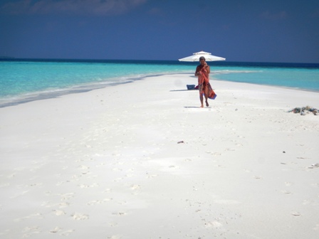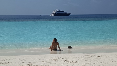 Ci spostiamo nell’atollo di Vaavu composto da due atolli geografici. L’atollo principale di Vaavu (o Felidhe Atoll) ospita le uniche 6 isole abitate (Felidhoo, Fulidhoo, Keyodhoo, Rakeedhoo e Thinadhoo). L’isola capoluogo Felidhoo dista meno di 80 km da Malé. Essendo l’atollo uno dei meno commercializzati delle Maldive, Vaavu offre immersioni davvero incredibili e un’autentica atmosfera maldiviana molto tranquilla. Nel pomeriggio, mentre gli altri fanno un’altra immersione, mi faccio accompagnare con il tender della "Princess Maani" assieme ad Angela su una lingua di sabbia bianca e deserta, poco distante da dove è ancorata la nostra barca. La spiaggia è piccolissima, non c’è vegetazione e sicuramente questa secca viene sommersa completamente quando c’è l’alta marea, ma è bellissima perché ci siamo solo noi. L’acqua color turchese è calda e cristallina, e passiamo quasi tutto il tempo in acqua, nonostante ci abbiano piantato un ombrellone sulla sabbia. Preferiamo cucinarci al sole e nuotare. Trascorriamo su questa isoletta un paio d’ore ed io mi sono sentito veramente come all’interno delle foto delle Maldive viste tante volte nelle brochure dei tour operator. Un vero paradiso! |