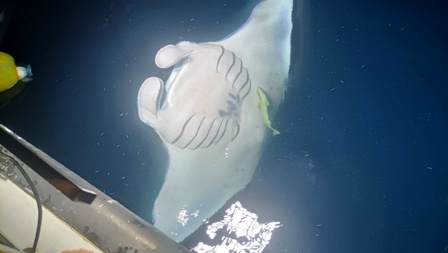 La sera verso le 18:30 è prevista un’immersione notturna extra per vedere la mante che mangiano, ma io e Angela preferiamo rimanere a bordo e guardare lo spettacolo dalla plancia di poppa della barca. Attirate dalla luce di potenti fari puntati sull’acqua dalla barca, le grosse mante volteggiano fino in superficie a pochissima distanza da noi, con la grande bocca spalancata per raccogliere il cibo, e riesco facilmente a filmarle e fotografarle insieme a un paio di grossi squali nutrice che nuotano anche loro in superficie. La danza delle mante continua per un bel pezzo ed è uno spettacolo davvero emozionante da vedere anche rimanendo in barca.