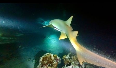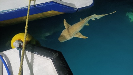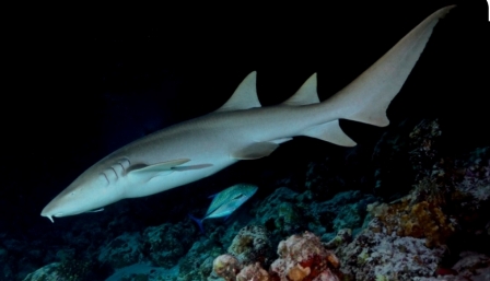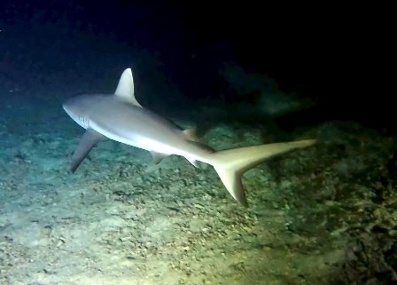 Lo squalo nutrice (Ginglymostoma cirratum) ha un colore uniforme bruno o nocciola, ha due bargigli sensoriali nasali e un occhio molto piccolo. E’ tra gli squali più grandi, la sua lunghezza media è di 2,5 metri e può raggiungere i 4,5 metri. Passa la maggior parte del tempo dormendo disteso sulla sabbia o all’interno delle cavità o (da qui il nome di "squalo dormiente") e la notte esce fuori per cacciare da solo. E’ piuttosto inoffensivo per l’uomo, perché si nutre solo di crostacei, piccoli pesci, molluschi, calamari, razze, aragoste e talvolta ricci di mare e coralli molli, ma se è disturbato può mordere con forza, nonostante la dentatura sia piuttosto minuta. Abbiamo trascorso tutta l’immersione circondati da questi squali che nuotavano veloci in tutte le direzioni attratti dalla luce delle nostre torce. Si trattava di esemplari molto grossi e abbiamo visto anche un paio di squali grigi, alcune grosse aquile di mare dal ventre bianco, dei grossi carangidi, cernie e diversi lion fish attratti dalle nostre torce. E’ stata un’immersione molto emozionante, specialmente quando un grosso squalo nutrice che non avevo visto mi è venuto addosso spingendomi con forza da un lato... in fondo l'oceano è casa sua.