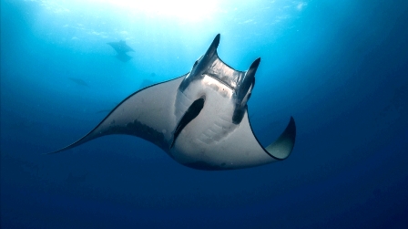 Quello con le mante (Manta alfredi) è tra gli incontri più ricercati ed emozionanti che si possa fare alle Maldive, dove vive stabilmente una popolazione che si stima essere la più numerosa al mondo. Le mante ("En Madi" nella lingua maldiviana) sono parenti stretti di squali e razze e, come loro, hanno uno scheletro costituito interamente di cartilagine. Vivono prevalentemente vicino alla costa, dove possono trovare abbondanza di zooplancton. Infatti, malgrado le loro notevoli dimensioni, le mante si cibano principalmente di piccoli crostacei, che fanno confluire nella loro grande bocca con l’aiuto delle pinne cefaliche. Le mante non hanno l’aculeo velenoso alla fine della lunga coda e quindi sono assolutamente innocue. |