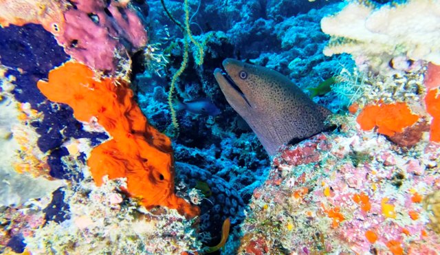 Preso dall’entusiasmo, decido di fare anche la terza immersione della giornata (nei giorni successivi mi limiterò a non più di due), anche perché si tratta dell’immersione su un relitto, che per me amante del "ferro" è imperdibile. Ci siamo spostati nell’atollo di Malè Sud e andiamo a visitare il relitto del "Kuda Giri", un cargo giapponese, lungo 30 metri fatto affondare intenzionalmente nel 1994 per creare una barriera corallina artificiale nella parte occidentale dell'isola di Dhigufinolhu, a ovest della quale si trova una piccola distesa di corallo sommersa quasi a pelo dell’acqua (detta "giri" nella lingua Dhivehi, mentre "kuda" significa piccolo). Lo scafo si trova sul lato sud-occidentale del reef ed è rivolto verso la barriera corallina con la prua a 18 metri e la poppa a 33 metri. Il relitto è ormai completamente colonizzato da numerose variopinte specie di corallo duro e molle, ascidie, spugne arancioni, rosse e gialle, e coralli a coppa arancioni (Tubastraea coccinea). Le lamiere del relitto offrono rifugio a grandi banchi di pesci di barriera di varie specie, come i glass fish che volteggiano insieme in massa all’interno e i pesci pipistrello, ed è al riparo dalle forti correnti e intorno ad esso ci sono i grandi predatori della barriera corallina come labridi e carangidi. |
