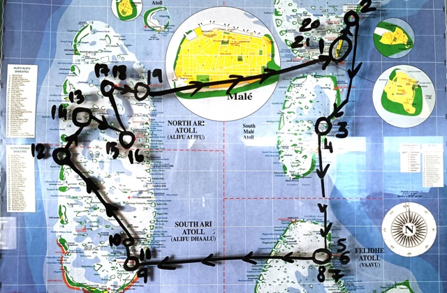 L’itinerario della nostra crociera di sette giorni ha il nome accattivante di "Best of Central Atolls" e, in effetti, è uno degli itinerari più belli e preferiti delle Maldive. Il viaggio inizia dall’atollo di Malè Nord e si naviga compiendo un cerchio in senso orario, fermandosi all’ancora ogni sera per trascorrere la notte in posti riparati. Dapprima abbiamo raggiunto l’atollo di Malè Sud, poi abbiamo proseguito fino all’atollo di Vaavu (conosciuto anche come atollo di Felidhoo), poi abbiamo navigato verso ovest raggiungendo l’atollo di Ari Sud e da lì siamo risaliti fino all’atollo di Ari Nord per poi chiudere il cerchio tornando nell’atollo di Malè Nord. |