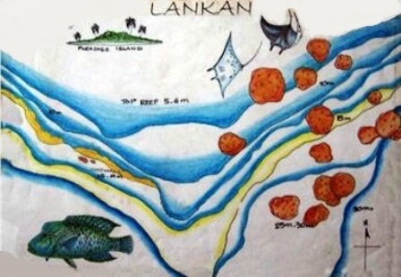 Dopo una breve navigazione verso nord, raggiungiamo il sito della seconda immersione della giornata, sul lato sud-orientale dell’atollo di Malè Nord, chiamato "Lankan Manta Point", vicino all’isola di Lankan Finolhu (che nella lingua locale significa "Paradiso"). Si tratta di una famosa stazione di pulizia delle mante (Manta alfredi) che vengono ripulite dai piccoli pesci pulitori (Labroides dimidiatus) che si nutrono dei piccoli crostacei e degli altri parassiti che si fissano sul corpo delle mante per succhiarne il sangue. Scendiamo all’esterno del lato orientale del reef che è in leggera pendenza e ci posiamo sulla sabbia del fondo a 25 metri per goderci lo spettacolo offertoci da un’infinità di grosse mante che ci volteggiano sopra la testa. Questi affascinanti animali sono inoffensivi perché si cibano solo di plancton che catturano convogliando l’acqua verso la bocca, aiutate dalle due pinne cefaliche molto mobili. Il nutrimento in seguito viene filtrato attraverso le cinque fessure branchiali che si aprono ventralmente sul corpo dell’animale. Dopo una ventina di minuti trascorsi appoggiati sul fondo, ci facciamo trasportare da una leggera corrente e vediamo una bella tartaruga verde (Chelonia mydas), tante murene grigie giganti (Gymnothorax javanicus), grugnitori, carangidi, cernie rosse maculate (Epinephelus cruentatus), pesci palla ocellati (Chanthigaster solandri), e tantissimi pesci colorati di barriera: pesci farfalla, pesci bandiera, pesci angelo, pesci chirurgo… un vero acquario sommerso! |