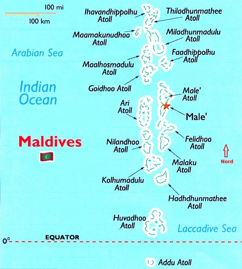 Ed eccoci finalmente alla data fatidica, il 28 novembre, segnata sul mio calendario ormai da un paio di mesi. Siamo all’aeroporto di Milano Malpensa, è un giovedì e abbiamo dovuto frettolosamente anticipare di un giorno la nostra partenza, perché il venerdì, come al solito, i sindacati hanno indetto uno sciopero generale e il nostro volo rischia di essere cancellato. Ci toccherà dormire per una notte a terra a Malè, in attesa di imbarcarci per la nostra crociera il sabato mattina. All’aeroporto incontriamo Andrea con sua moglie Pamela e Federico che collabora con Andrea al "Techdive" di Arenzano, un diving center al quale sono particolarmente legato. In barca conosceremo le altre due italiane che fanno parte del nostro gruppetto, mentre gli altri ospiti a bordo saranno quasi tutti stranieri di diverse nazionalità. Con un comodo volo della Qatar Airways, e uno scalo a Doha di tre ore, raggiungiamo l’aeroporto internazionale "Velana" alle Maldive, che si trova sull'isola di Hulhulé, una piccola isola disabitata che sorge a fianco della capitale del paese Malè, alla quale è unita da un lungo ponte. Non tutte le isole che formano gli atolli maldiviani sono naturali. La maggior parte sono formate da vulcani, altre invece sono artificiali. Ad esempio, Hulhumale, l’isola più vicina all’aeroporto, è un’isola artificiale che è stata creata nel 2004. Altre isole poi stanno scomparendo a causa dall’erosione naturale e dell’innalzamento del livello del mare. |