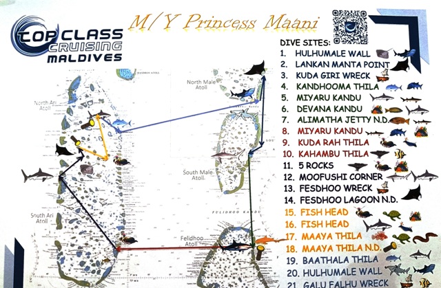 L'itinerario della crociera negli atolli centrali e le nostre immersioni |