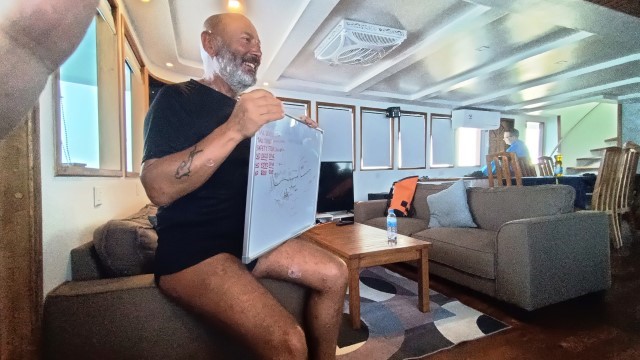 Domenica 22 febbraio ore 11.30 – DHEKUNU KANDU (Vattaru Atoll) dopo aver saltato la prima immersione del mattino nella pass di MIYARU KANDU (perché ogni tanto non mi va di svegliarmi alle 6 e di lottare con la corrente), decido di fare la più “tranquilla” seconda immersione della giornata. Si tratta del canale meridionale dell’atollo di Vattaru, un piccolo atollo circolare di circa 9 km di diametro situato tra l'atollo di Vaavu a nord e l'atollo di Meemu a sud. Questa pass, cha fa parte della più ampia area protetta di Vattaru Kandu istituita nel 1999, funge da corridoio marino vitale a supporto di diversi ecosistemi. L’immersione non è affatto tranquilla, perché la corrente è molto forte. Scendiamo fino a una trentina di metri e restiamo per una ventina di minuti aggrappati con i rampini sul bordo della piccola pass che si affaccia sull’oceano. Davanti a noi si presenta il solito scenario di squali pinna bianca di barriera che nuotano nel blu, insieme a tonni e aquile di mare. La visibilità è ottima e la luce del sole si riflette sulla sabbia bianchissima del fondale. Dopo un po’ ci stacchiamo dal fondo e ci facciamo trascinare all’interno della laguna dalla corrente che diventa sempre più impetuosa, mentre smaltiamo i pochi minuti di decompressione accumulati sul fondo. Dopo pranzo navighiamo verso nord e raggiungiamo l’atollo di Kaafu, anche noto come atollo di Malè Sud, dove faremo l’ultima immersione della giornata e resteremo ancorati per la notte. |