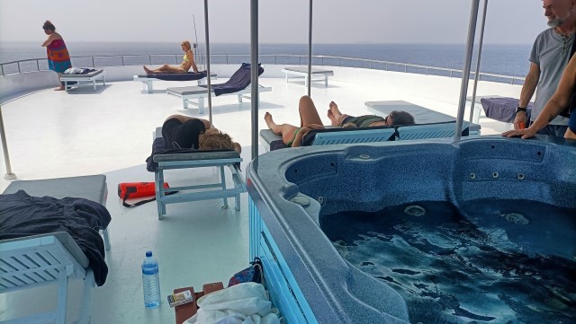 Salto la seconda immersione della giornata a HUKURVELHI BEYRU e in attesa del pranzo, anche se fa caldo, mi concedo un po’ di relax sul ponte superiore della barca. Sono sempre con la muta addosso e non posso tornare a casa dalle Maldive senza un minimo di abbronzatura!