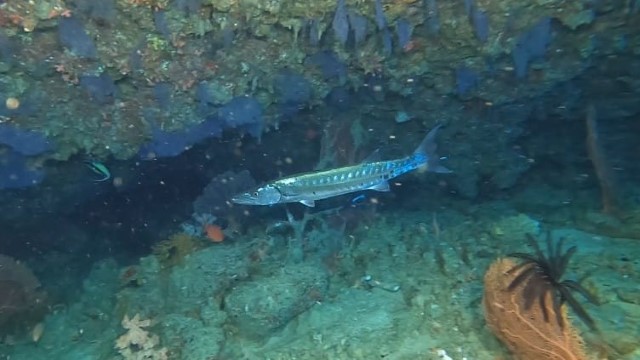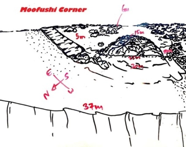 Ore 14:30 – DEVANA KANDU (Vaavu Atoll) dopo aver navigato verso est raggiungiamo il piccolo atollo di Vaavu e c’immergiamo sul lato orientale dell’atollo. Devana Kandu è un'area marina protetta, nota per le sue immersioni in corrente, la ricca vita pelagica e i paesaggi corallini spettacolari. Questo canale (kandu) offre uno scenario fatto di sporgenze e piccole grotte, ricco di squali grigi, squali pinna bianca, aquile di mare, banchi di fucilieri e coralli molli colorati. Ci tuffiamo giù a capofitto controcorrente fino a raggiungere il bordo del drop off a 35 metri di profondità e ci aggrappiamo alle rocce per riprendere fiato e osservare il “teatro pelagico” d’azione: un folto gruppo di squali grigi che nuotano avanti e indietro davanti a noi. Staccatici dal fondo dopo una ventina di minuti, iniziamo la drift dive, facendoci trascinare dalla corrente vorticosa. Le condizioni ambientali solo le migliori perché l’alta marea genera una corrente entrante che dall’oceano porta acqua limpida all’interno della barriera attivando la catena alimentare e garantendo la presenza di grandi pesci. Voliamo letteralmente sopra il fondo sabbioso della pass rimanendo a 25 metri, mentre tutto scorre velocemente attorno a noi come in un film. Non c’è molto tempo per osservare il pesce, perché la corrente fortissima ci trascina via; comunque riesco a vedere almeno una bella murena leopardo (bianca con macchie nere e gialle) che spunta fuori dalla sua tana. L’immersione è molto breve perché la fatica dovuta alla corrente ci fa consumare moltissimo gas. Peccato.