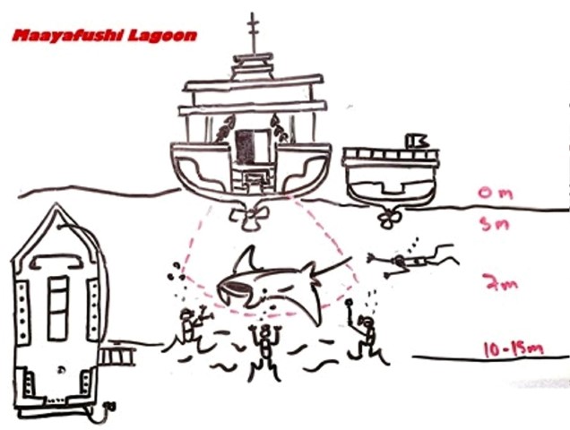 Poco dopo aver preso possesso delle cabine assegnatici e aver montato l’attrezzatura subacquea sulle bombole già predisposte sul dhoni la barca si è mossa e ci ha portati fuori dal porto per fare la nostra check dive. Verso le 15:30 ora locale siamo scesi in acqua di fronte all’isola artificiale di Hulhumale. Questo sito, pur essendo formato da una semplice distesa di sabbia punteggiata da alcuni piccoli scogli corallini, ha la particolarità di essere popolato da un’infinità di razze giganti e di squali di ogni specie. La visibilità era piuttosto scarsa, con un’acqua lattiginosa, anche a causa del grande “traffico” di razze giganti che volteggiavano veloci sopra le nostre teste smuovendo la sabbia del fondale. Squali pochi rispetto al ricordo dell’ultima volta che ero stato qui. Io ho visto solo un paio di pinna bianca e un buffo squalo chitarra, oltre a tanto piccolo pesce di barriera.Immersione non particolarmente interessante, ma il suo scopo era essenzialmente quello di controllare la nostra pesata e fare una prova di lancio del pedagno.Tornati a bordo poco dopo è stata servita la cena al buffè, che ha dato ufficialmente inizio a quella che ho chiamato “Chicken and current cruise”. Praticamente da quel momento in poi il buffet prevedeva sempre pollo cotto nelle maniere più svariate sia a pranzo che a cena , e le immersioni si sono svolte praticamente quasi tutte in corrente molto forte.La nostra crociera è durata nove giorni dal 15 al 23 febbraio e si è svolta lungo il classico itinerario degli atolli centrali: Malè Nord, Rasdhoo, Ari Nord, Vaavu e Ari Sud, navigando in senso antiorario. Durante la crociera sono state fatte 23 immersioni (ma io ne ho fatte solo 20): praticamente 3 immersioni al giorno, tranne il primo e l’ultimo giorno. |
