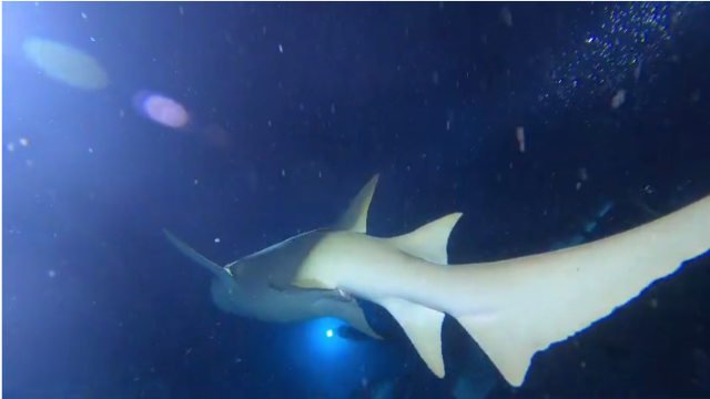 Ore 19:00 – ALIMATHA JETTY (Vaavu Atoll) questa è la classica immersione notturna in un sito molto famoso per l’abbondante presenza di grossi squali nutrice che stazionano nei pressi del pontile (jetty) della piccola isola di Alimatha. Scendiamo in acqua che e gia buio e iniziamo la ricerca degli squali, che però all’inizio non si fanno vedere. La cosa insolita in questo puto d’immersione è che questa volta c’è una forte corrente che ci costringe a rimanere aggrappati alle rare rocce che spuntano dal fondo sabbioso. Rimaniamo per un po’ di tempo in ginocchio sulla sabbia bianca con il naso all’insù in cerca degli squali, ma vediamo solamente un grosso pinna bianca e un nutrice. Ci spostiamo un po’ dall’altro lato del pontile e, finalmente, appaiono 5-6 squali nutrice che ci nuotano accanto per una mezzoretta e approfittano della luce prodotta dalle nostre torce per fare una scorpacciata del plancton diffuso nell’acqua. Lo squalo pinna bianca si è spostato insieme a noi e continua a farci compagnia insieme a un gruppo di carangidi in caccia. Vediamo anche una grossa aragosta che ci stuzzica l’appetito ricordandoci che ormai è ora di cena, perciò dopo una cinquantina di minuti risaliamo sul nostro dhoni. |