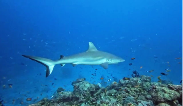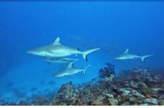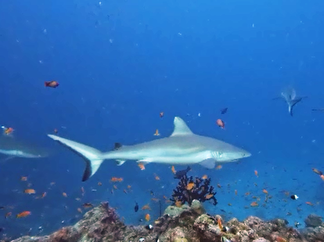 Giovedì 19 febbraio ore 7:30 – FISH HEAD (Ari North Atoll) questo è uno dei siti d’immersione più famosi delle Maldive, protetto dal governo e rinomato per l’abbondanza di vita marina, specialmente squali grigi di barriera, pesci Napoleone e formazioni coralline. Ci tuffiamo nel blu e nuotiamo contro corrente fino a raggiungere la thila circolare che ha pareti ripide, grotte e strapiombi che precipitano in profondità. Ci trasciniamo con le mani sulla roccia sino ad arrivare ad una balconata affacciata nel blu dalla quale possiamo osservare il passaggio degli squali grigi e dei pinna bianca. La corrente è molto forte e rimaniamo aggrappati per una cinquantina di minuti ad osservare una specie di acquario in movimento: davanti a noi oltre agli squali nuotano grossi carangidi, una bella aquila di mare, banchi di fucilieri e variopinti pesci farfalla. Il tempo trascorre in fretta e ci facciamo portare dalla corrente sul cappello della secca per poi risalire nel blu ed essere ripescati dal dhoni.