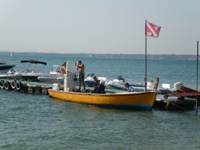 Ma andiamo per ordine… Tutto è cominciato venerdì 21 luglio 2006. Sono arrivato a Moniga del Garda il venerdì sera, assieme a mia moglie Angela, per festeggiare il secondo anniversario del Diving Porto di Moniga, gestito da Mark e Chick. Questi miei nuovi amici li ho conosciuti circa due mesi fa, navigando nel Web ed entrando nel forum di Scuba & Friends, un bel portale dedicato alla subacquea. Ho incominciato a scrivere, a scambiare esperienze ed emozioni subacquee ed è nata una "amicizia virtuale". Soltanto un mese fa non avrei mai pensato che da questo contatto telematico potesse scaturire qualcosa di così particolare come un’immersione nel lago. Poi, nel giro di poche settimane, la cosa ha cominciato a prendere corpo e sono stato invitato a partecipare al "II° Complediving"del Diving di Moniga. Ne ho parlato con Angela e abbiamo deciso di fare questa esperienza di lago che ancora ci mancava e di regalarci un bel weekend sul Garda. E adesso eccoci qui, seduti a tavola con Marco e Alessandra, a parlare di questa nuova emozionante esperienza che ci attende il giorno dopo. Io e Chick, che ci siamo già conosciuti nel Web, parliamo fitto fitto, cercando di annullare in fretta la distanza della nostra conoscenza telematica e gettando le basi di una nuova amicizia reale. Questo non c’impedisce di mangiarci due enormi pizze "disco volante" servite sul tagliere di legno, che vengono bruciate nel giro di pochi minuti…