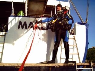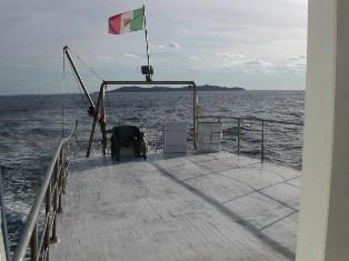 Mentre noi pranziamo verso le quattro, l’altro gruppo di sub, più fortunato di noi si immerge sulle macchine del "Nasim" e, quando tornano, scopro che… ci siamo ormeggiati proprio sopra! Pazienza. Il resto della giornata passa tra una chiacchiera e l’altra, nell’attesa di riunirci tutti insieme per la cena preparata da Gianni, che si preannuncia interessante… Alcuni scendono a terra con il gommone per una passeggiata sull’isola, poi, al ritorno, Stefano e Alessia si lanciano in un bagno notturno al chiarore della luna piena che splende sopra a Giannutri, invitati da una temperatura dell’acqua intorno ai 18 gradi. L’acqua, illuminata dal potente faro acceso a poppa della barca, è limpidissima e, praticamente, i due ragazzi fanno il bagno in mezzo ai pesci. La sera ci vede di nuovo tutti riuniti attorno alla grande tavola, a fare onore alla ricca cena di pesce preparata da Gianni. Diversi chili di spaghetti al pomodoro con filetti di tonno fresco e un’abbondante frittura di trigliette e sardine spariscono rapidamente nei nostri stomaci di subacquei affamati, innaffiate da generose dosi di un vinello bianco fresco fresco. L’allegria e la gioia per i primi tuffi fatti assieme sono palpabili e non vediamo l’ora di tuffarci di nuovo.