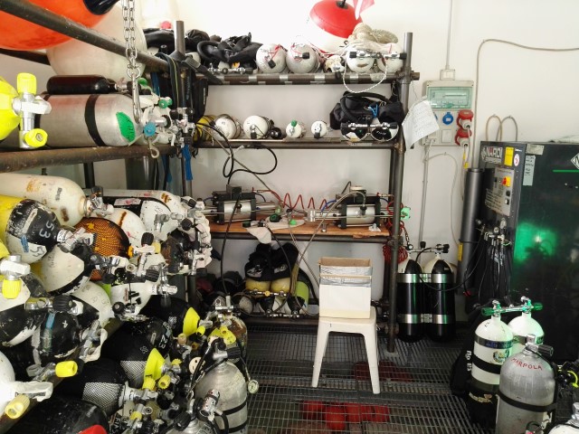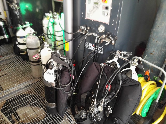 Ritorniamo al "TECHDIVE" (lo storico diving, che un tempo fu di Gino Sardi ed oggi è gestito da Andrea Bada con un ottimo Staff) e scarichiamo tutta la nostra attrezzatura, poi controlliamo i nostri gas per il giorno dopo e ci diamo appuntamento all’indomani mattina. La sera ce ne andiamo a cena in un buon ristorante di pesce, dove una bottiglia di ottimo "Pigato" ghiacciato mi aiuta a scacciare i miei pensieri cupi. La notte in albergo cado in un sonno profondo, nel quale si agitano ancora i miei fantasmi. La mattina seguente ci presentiamo al diving con largo anticipo, prepariamo l’attrezzatura e ascoltiamo il briefing della nostra guida. Non ce ne sarebbe bisogno: ho ripassato mentalmente quel percorso cento volte e lo conosco a memoria. Ma un po’ di ansia rimane... Poi finalmente c’imbarchiamo sul gommone e in breve siamo sul nostro punto d’immersione, segnalato dalla boa di ormeggio. Le condizioni meteo marine oggi sono perfette: mare calmo, assenza di corrente e – come scopriremo appena messa la testa sott’acqua – una visibilità infinita. In questo primo giorno ho chiesto che ci accompagni una guida, almeno nella prima parte dell’immersione. Questo scaccerà via le mie restanti paure. Mentre scendo in caduta libera nel blu seguendo la linea della cima che arriva sul tetto del cassero di poppa provo un meraviglioso senso di libertà e man mano che il relitto si avvicina mi sento sempre meglio. Per un attimo mi tornano in mente i fantasmi dell’ottobre 2008, ma poi mi passa tutto e mi concentro sull’immersione che ho già ben visualizzato a terra durante il briefing. Giusto il tempo di dare un’occhiata alle decine di grossi dentici e saraghi fasciati che nuotano sopra la tuga e poi scendiamo rapidamente fino alla coperta della nave a 54 metri di profondità, seguendo la nostra guida. Nuvole di anthias rosa ci circondano e si muovono all’unisono. La visibilità è davvero perfetta e la luce bassa e radente rende ancora più misterioso e affascinante il grande relitto. Sorvoliamo il ponte di coperta e la sala macchine, poi facciamo un giro nel corridoio dell’officina sul retro del castello. Passando dall’officina do un giro alla grande morsa attaccata al bancone di lavoro. Lo fanno tutti i sub: è un gesto scaramantico che permette di ritornare ad immergersi qui e che io feci l’ultima volta nove anni fa… Nuotiamo intorno al castello di poppa ed entriamo nella sala delle pompe che si trova sul davanti. Le grandi valvole sono ancora come me le ricordavo, un’immagine fissata in maniera indelebile nella mia mente. Quando la nostra guida (che respira aria) ci lascia, proseguiamo noi due da soli risalendo sui vari ponti fino all’interno della plancia di comando. Sul tetto della controplancia nuota una moltitudine di grossi dentici e di saraghi, incuranti della nostra presenza. Non ne ho mai visti così tanti tutti insieme. Al momento stabilito ci stacchiamo dal relitto ed iniziamo la risalita nel blu, rimanendo in vista della cima che arriva in superficie; poi facciamo la nostra lunga decompressione in libera seguendo la tabella che ci eravamo preparati. Tutto procede perfettamente. Mi sento bene. Ansie e paure sono rimaste laggiù… un lontano ricordo che andrà sbiadendo nel tempo. Mentre facciamo la deco, chiudo gli occhi e rivedo quasi come in un film lo spettacolo meraviglioso che ho appena visto là sotto… è un film bellissimo che per fortuna sarà replicato nei giorni seguenti.