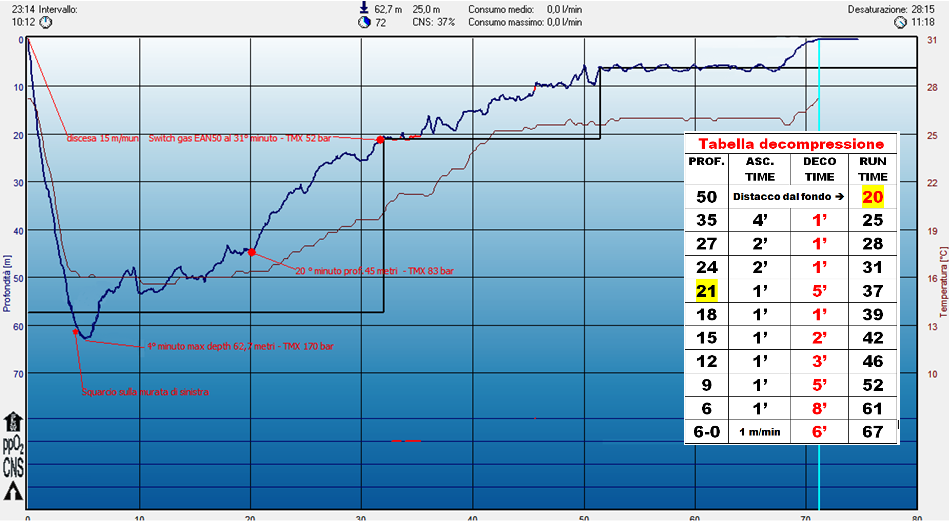 Sotto: il profilo e il percorso di una delle nostre tre immersioni |