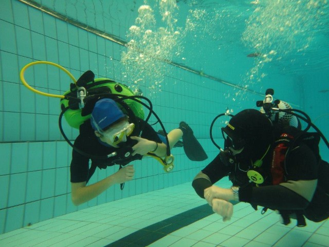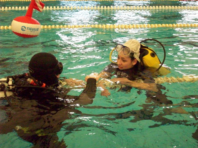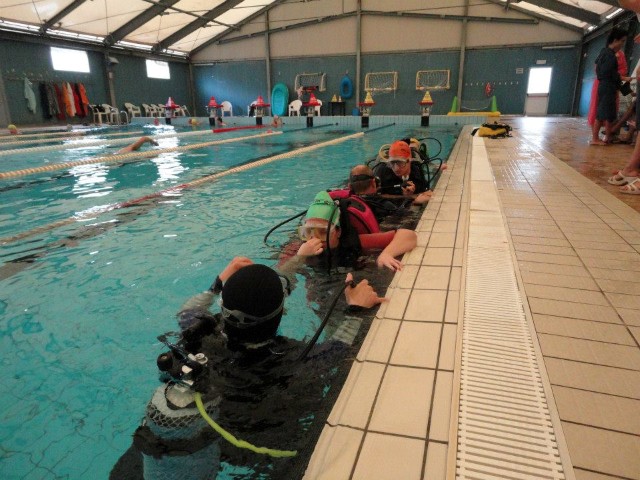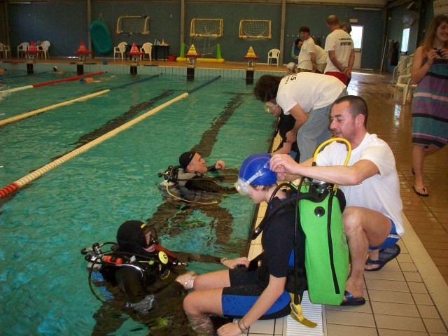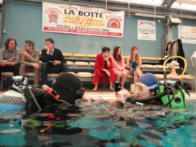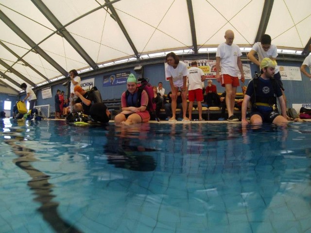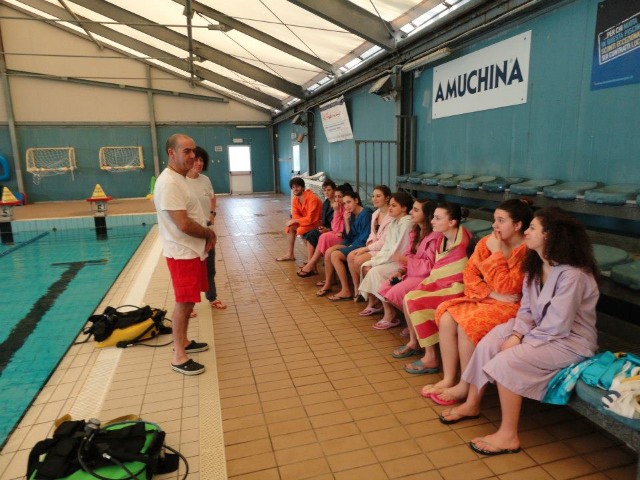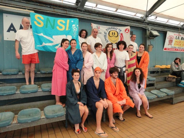 In seguito, nel mese di marzo del 2013, si è entrati nel vivo del progetto, con il battesimo dei nuovi aspiranti subacquei in piscina. Per sei domeniche consecutive, gruppi di una ventina di ragazzi (prevalentemente ragazze tra i 15 e i 17 anni) sono stati accompagnati in acqua da noi istruttori durante la loro prima immersione. L'organizzazione delle giornate, con il coordinamento dell'infaticabile Giacomo, è stata perfetta. Dopo un breve briefing all’asciutto, sotto lo sguardo attento dei genitori che li hanno accompagnati in piscina, i ragazzi sono stati assistiti nella vestizione dallo staff dello "Smile Diving" e, una volta indossata l’attrezzatura necessaria, messa a disposizione dalla Free Shark di Bologna e dal Bonifazi Center Shop di Numana, sono stati accompagnati in acqua ciascuno da un istruttore. |