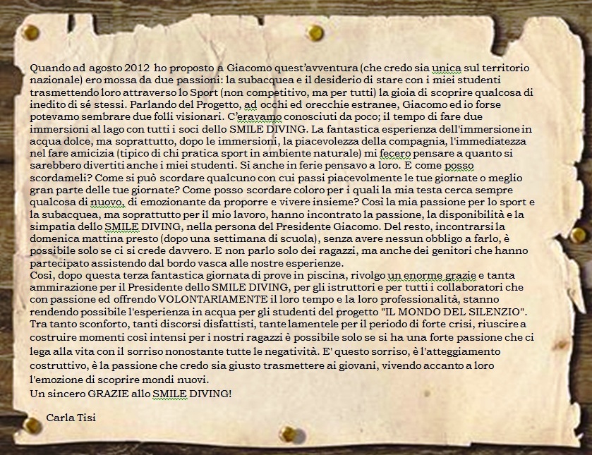 E’ per questo motivo che quando il mio Circolo subacqueo - lo "Smile Diving" di Porto Recanati - ha lanciato il progetto denominato "IL MONDO DEL SILENZIO" ho deciso immediatamente di partecipare, felice di poter dare il mio piccolo contributo per portare in acqua i ragazzi e sicuro che ne avrei ricavato la gioia e l’emozione di quegli sguardi felici e stupiti che ti ripagano ampiamente della fatica.