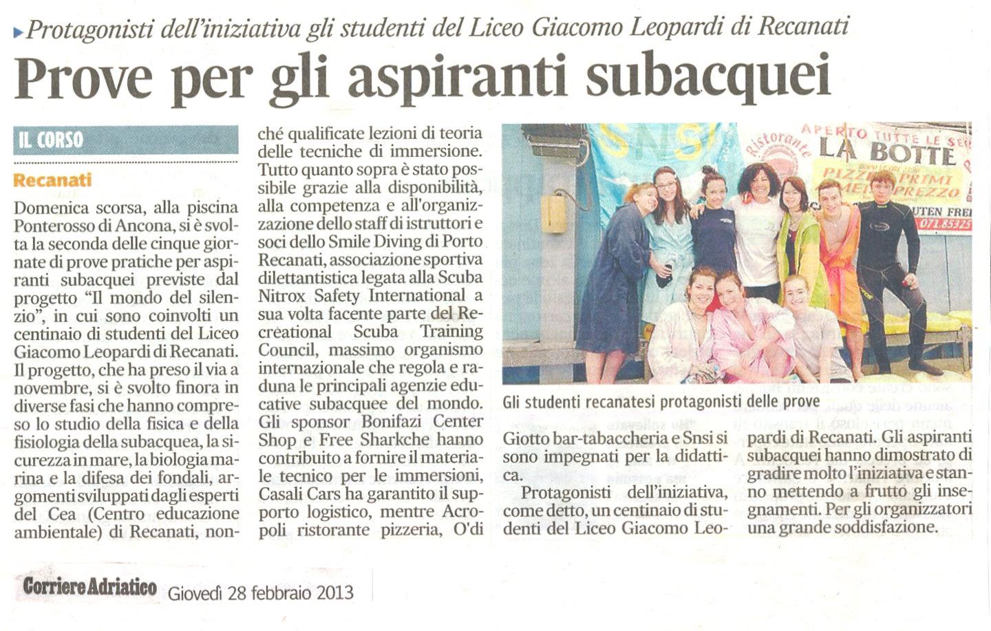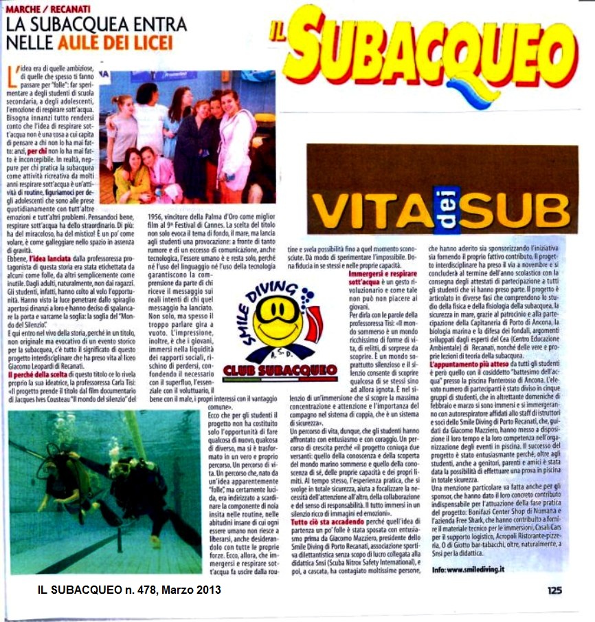 Con il supporto tecnico dell’agenzia didattica SNSI (Scuba Nitrox Safety International) della quale fa parte lo "Smile Diving" e con il contributo indispensabile di alcuni sponsor, ha così preso il via un progetto articolato in più fasi che accompagnerà i ragazzi che vi hanno aderito quasi fino alla fine dell’anno scolastico. Dapprima si sono tenuti presso la scuola degli incontri introduttivi durante i quali, oltre ad essere stati illustrati i fondamentali della fisica e della fisiologia necessari per praticare l’immersione subacquea con autorespiratore, si è parlato della sicurezza in mare, della biologia marina, della salvaguardia dei fondali marini e delle tecniche basilari per praticare la subacquea. Questo è stato possibile grazie alla partecipazione convinta di alcuni professori del Liceo "Leopardi", della Capitaneria di Porto di Ancona, del Centro Educazione Ambientale di Recanati e degli istruttori subacquei dello "Smile Diving".
