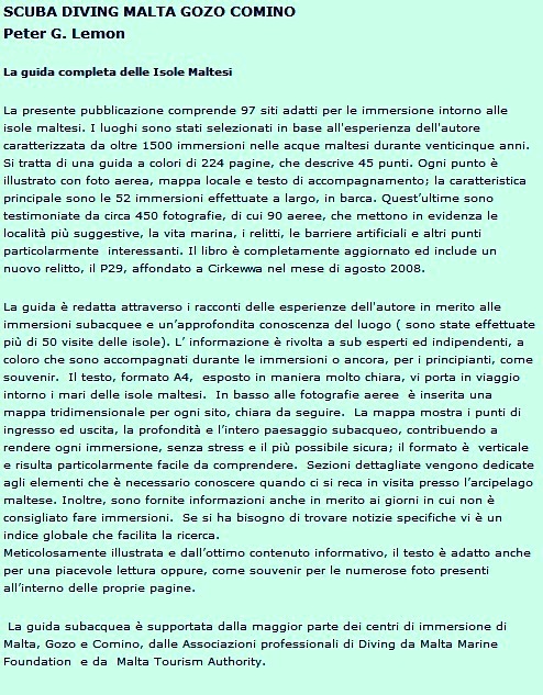 Gozo: “Inland Sea”-Prof. max 28 m. - Run time 55 min. - Temp. 16 °C - Gas: EAN32 Il cosiddetto "Inland Sea" (mare interno) si trova all’inizio di Dweira Point, sulla destra, nella piccola baia chiusa, di fronte alle capanne dei pescatori e a un piccolo utilissimo bar. Quando le condizioni sono perfette come quando ci siamo immersi noi si tratta di una delle più emozionanti immersioni all’isola di Gozo: si passa infatti lungo uno stretto tunnel che si estende per 80 metri attraverso il promontorio, per sbucare al di là di esso in mare aperto. Diverse imbarcazioni passano avanti e indietro sopra la testa dei sub, ma la parete è così profonda, verticale e dotata di appigli, che rimanendo bassi non c’ è alcun pericolo. Per evitare le imbarcazioni entriamo dalla riva attraverso lo scivolo sul lato sinistro e nuotiamo in superficie per un po’, poi ci tuffiamo a 4 metri raggiungendo l’angolo a sinistra del tunnel e nuotiamo stando bassi lungo il lato sinistro del tunnel evitando le barche turistiche che passano sopra la nostra testa. Il lungo corridoio scende a gradoni a 5, 9 e 15 metri, quindi si trova un fondo di ciottoli intorno ai 25 metri di profondità. La vista, non appena ci affacciamo nel profondo blu indaco del mare aperto, è spettacolare! |