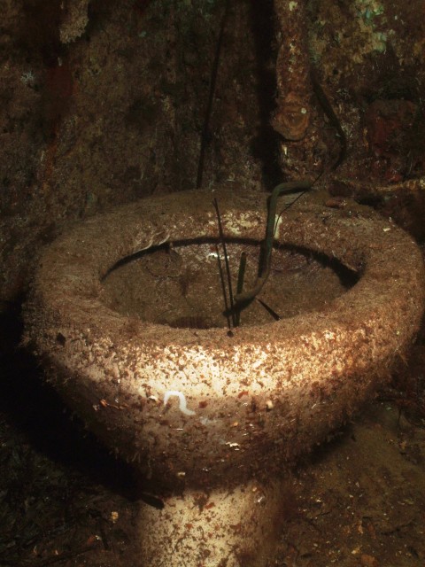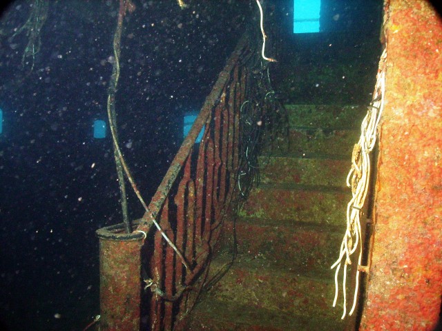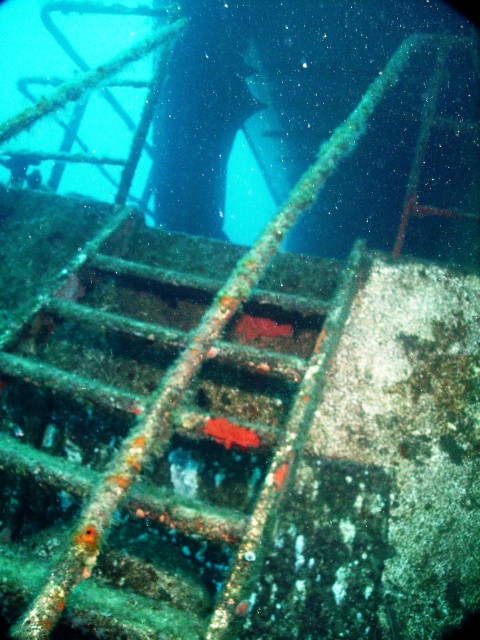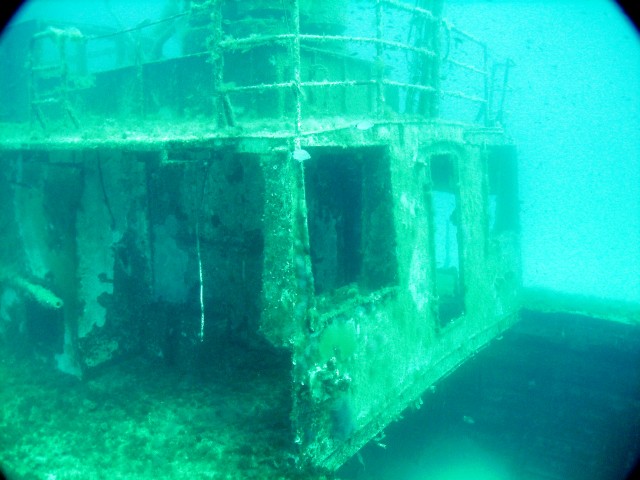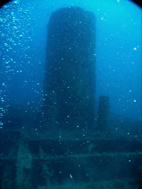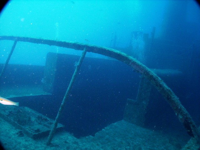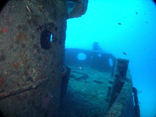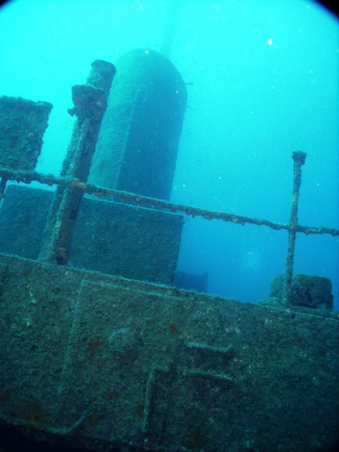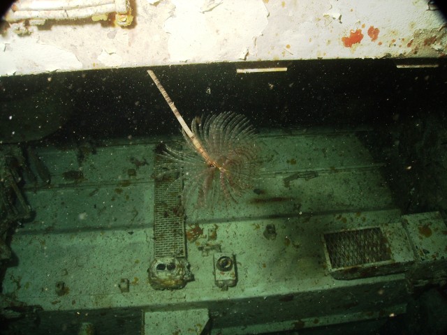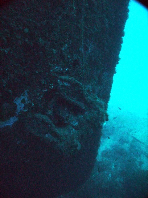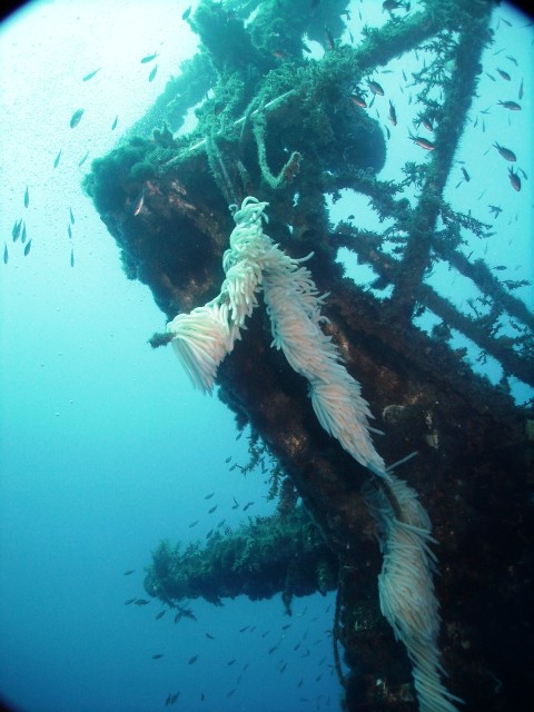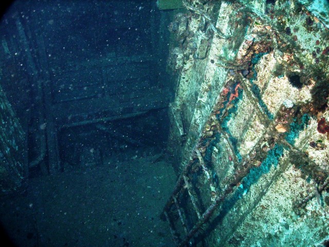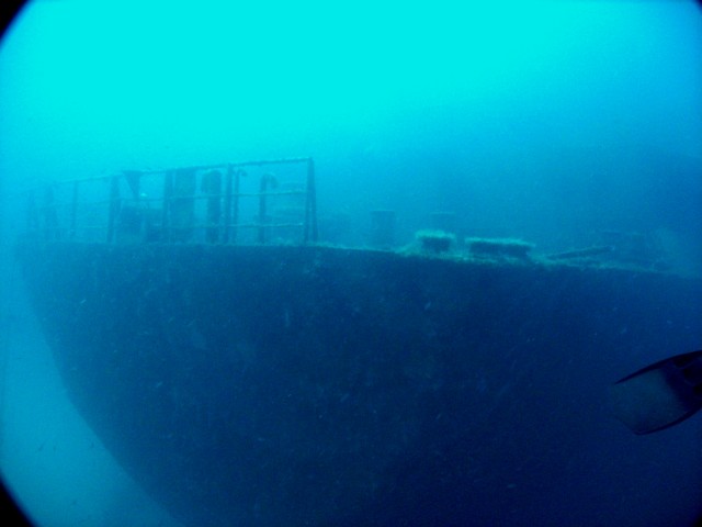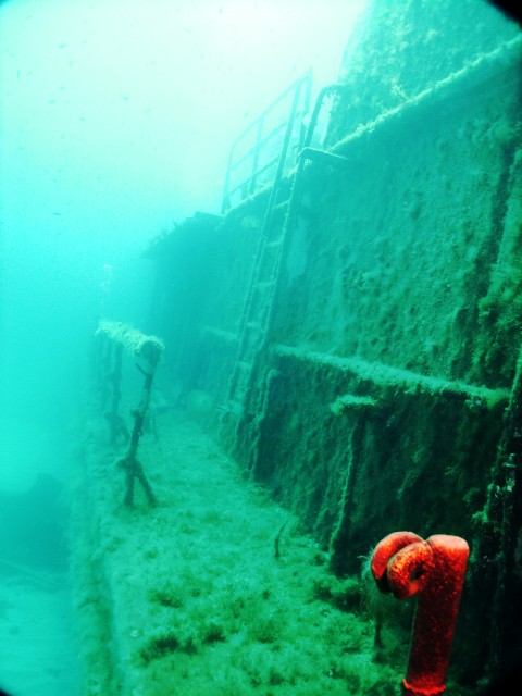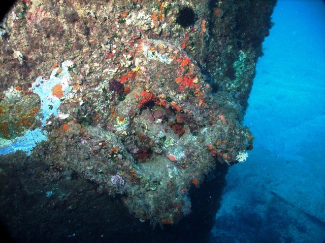 Facciamo un bel giro da poppa a prua della nave, che è lunga una cinquantina di metri, e penetriamo al suo interno. Purtroppo però il tempo impiegato per raggiungere a nuoto il relitto ci ha fatto consumare parecchia aria e non resta molto tempo per le penetrazioni. Peccato, perché il relitto è stupendo e offre numerosi spunti per belle fotografie. |