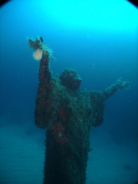 ![]() Sotto: alcune immagini del relitto dell'Imperial Eagle (foto di Sandro Costa), la statua del Cristo e l'ancora nell'occhio di cubia. |