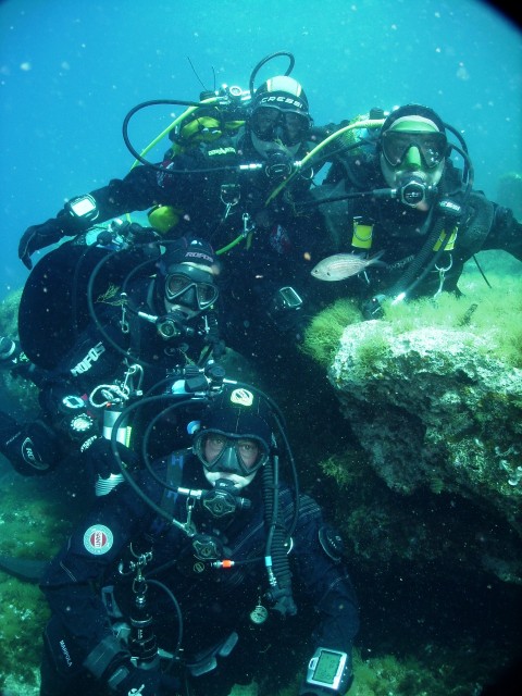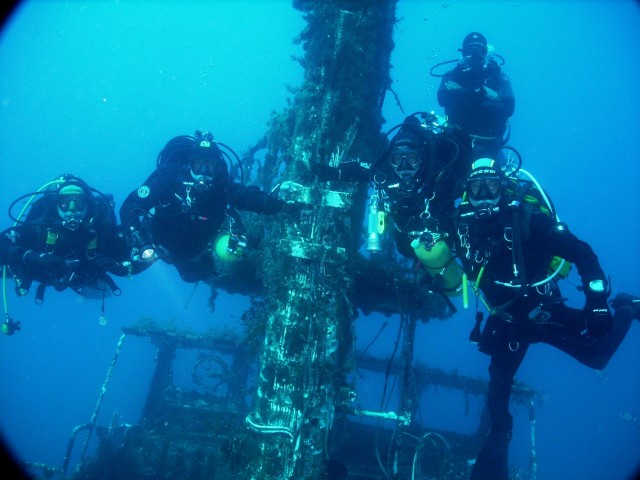 Sopra: riuniti attorno all'albero del "P29", in un'acqua cristallina.