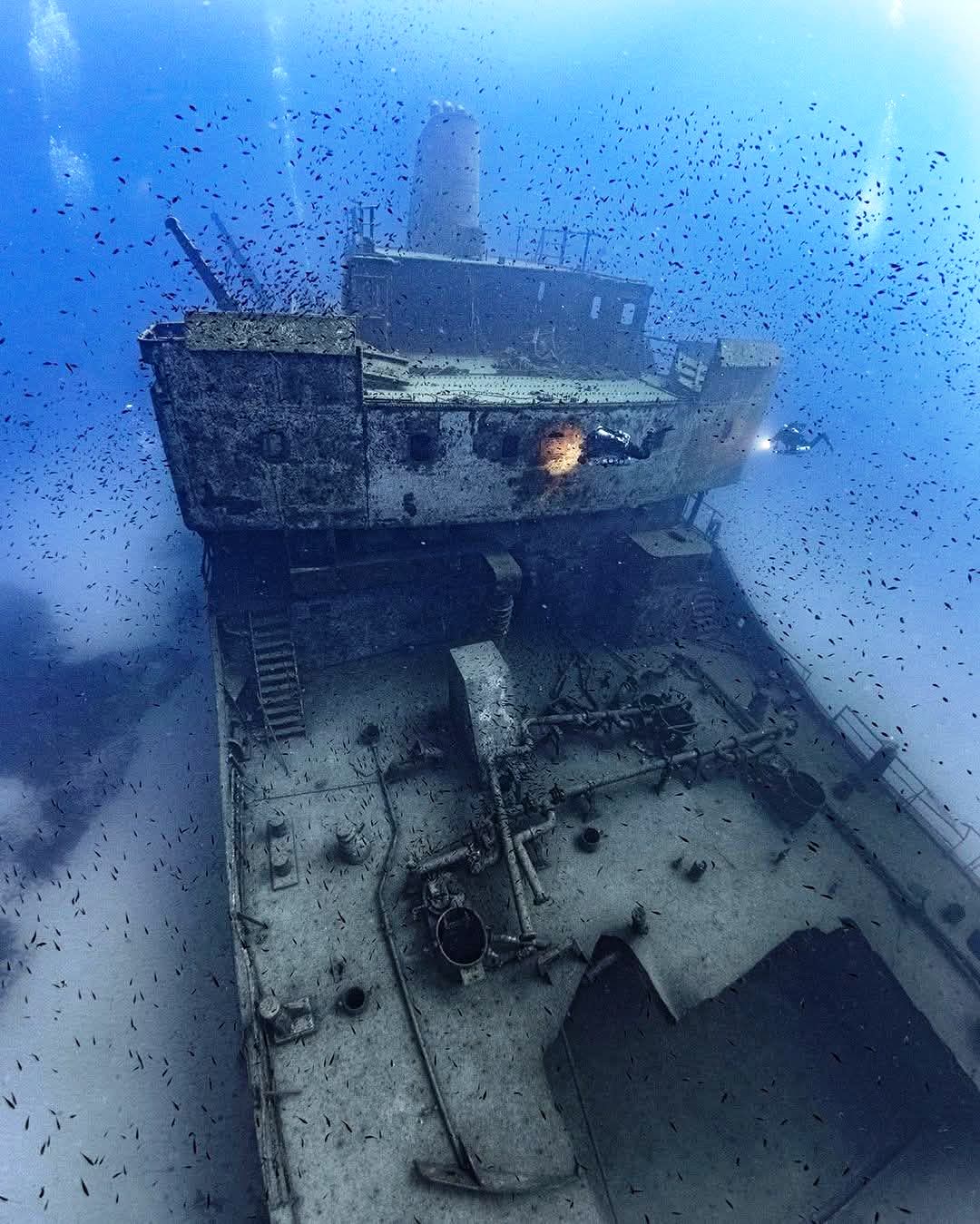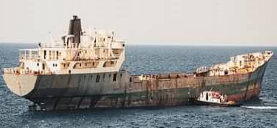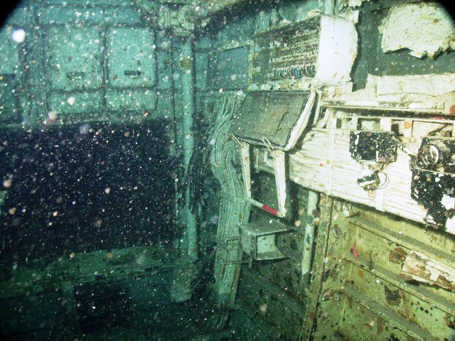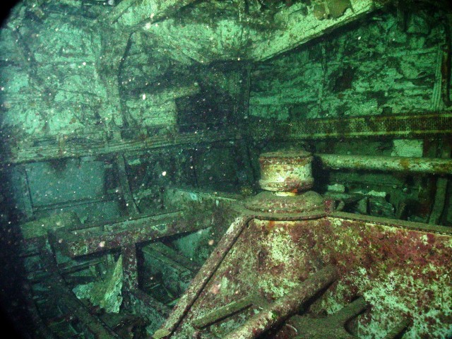 Sopra l'interno del relitto della petroliera "Um el Faroud". |