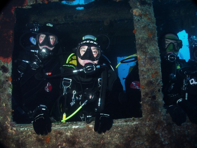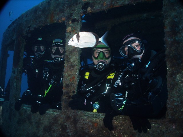 | Sopra:Sandro, Claudio e Gianni....i tre fusti. Sotto: alcune suggestive immagini riprese da Sandro Costa sul relitto del rimorchiatore "Rozi". | |