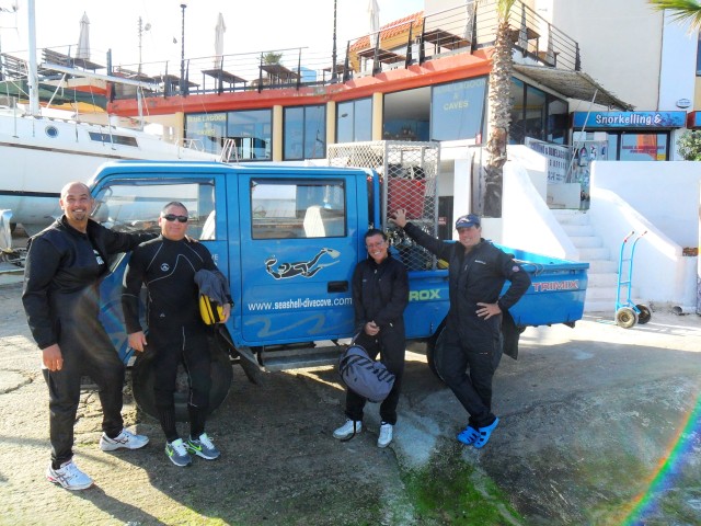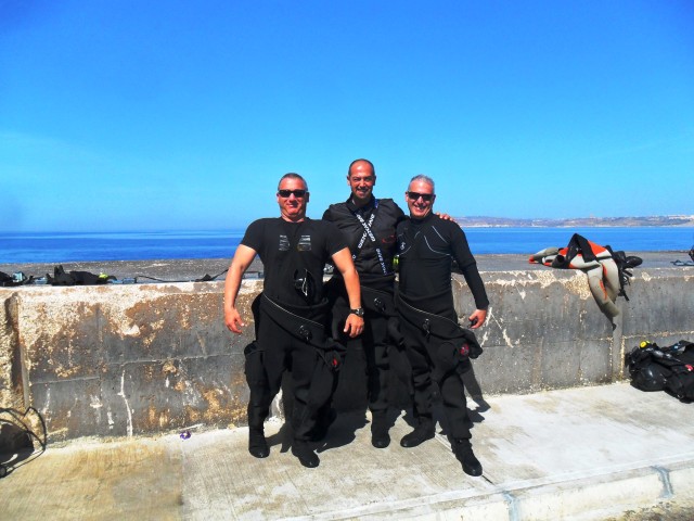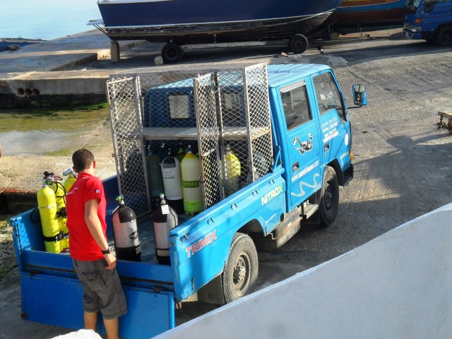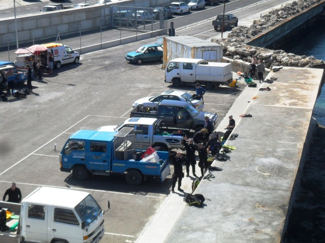 Sabato 13 Aprile 2013 La nostra terza giornata prevede due immersioni da terra dal piazzale di Cirkewwa da dove partono i traghetti per Gozo. La prima immersione è sul relitto del pattugliatore “P29” in aria con stage di EAN50 e la seconda sul “Madonna reef” con EAN 36. Carichiamo bombole e attrezzatura sul truck e ci dirigiamo a Cirkewwa dove praticamente c’è un grande piazzale per subacquei, raggiungibile con una strada che ha addirittura una corsia riservata ai subacquei. Sul piazzale vediamo parcheggiati una decina di altri camioncini e pulmini di sub, ma ci sono anche i bagni chimici (che preferiamo non utilizzare) e un attrezzatissimo bar ambulante dove si può prendere da bere e da mangiare. Qui a Malta i subacquei sono una grossa fetta del turismo locale, e si vede bene da come si sono organizzati. Altro che in Italia, dove spesso i sub sono ghettizzati ed osteggiati! Ci vestiamo con calma sul piazzale e con un po’ di fatica scendiamo lungo lo scivolo e la scaletta che portano in acqua a circa 150 metri dal punto d’immersione. Abituati alle comode immersioni dalla barca siamo un po’ perplessi, ma d’ora in poi sarà così per tutti i prossimi giorni e non ci resta che rassegnarci… |