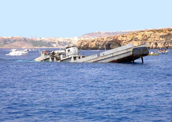 Oggi il relitto giace in assetto di navigazione su un fondo sabbioso alla profondità di 42 metri, a circa 300 metri a nord-ovest di Qwara Point ed è pedagnato con una grossa cima che arriva a una boa in superficie. La grande stiva ha una grande spaccatura di facile accesso che rende l’immersione poco impegnativa e divertente. Si può agevolmente entrare e nuotare nella passeggiata del ponte superiore. Poco distante dal relitto, a 25 metri di profondità c’è la statua del Cristo, benedetta da Papa Giovanni Paolo II nel 1990 e poi immersa a protezione dei pescatori maltesi. Vicino alla statua c’è un bel tunnel passante attraverso un grande masso, con la volta coperta di coralligeno multicolore e di spugne incrostanti, mentre poco distante si trova un’ancora del XVII secolo. |