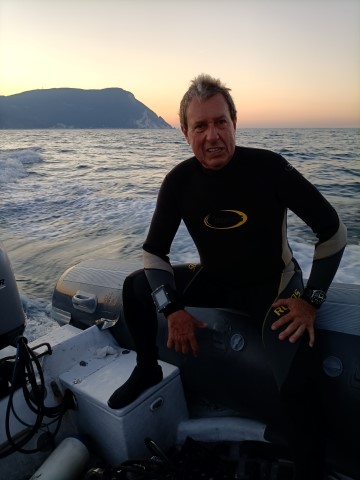 Mentre navighiamo verso est con un po’ di onda di prua, osservo le ultime luci del tramonto dietro il profilo scuro del Monte Conero. Il sole si è tuffato nel mare e il cielo è tinto di arancio. E' uno spettacolo davvero mozzafiato. Arriviamo in dieci minuti alle boe fisse che segnalano il relitto e ormeggiamo il gommone.