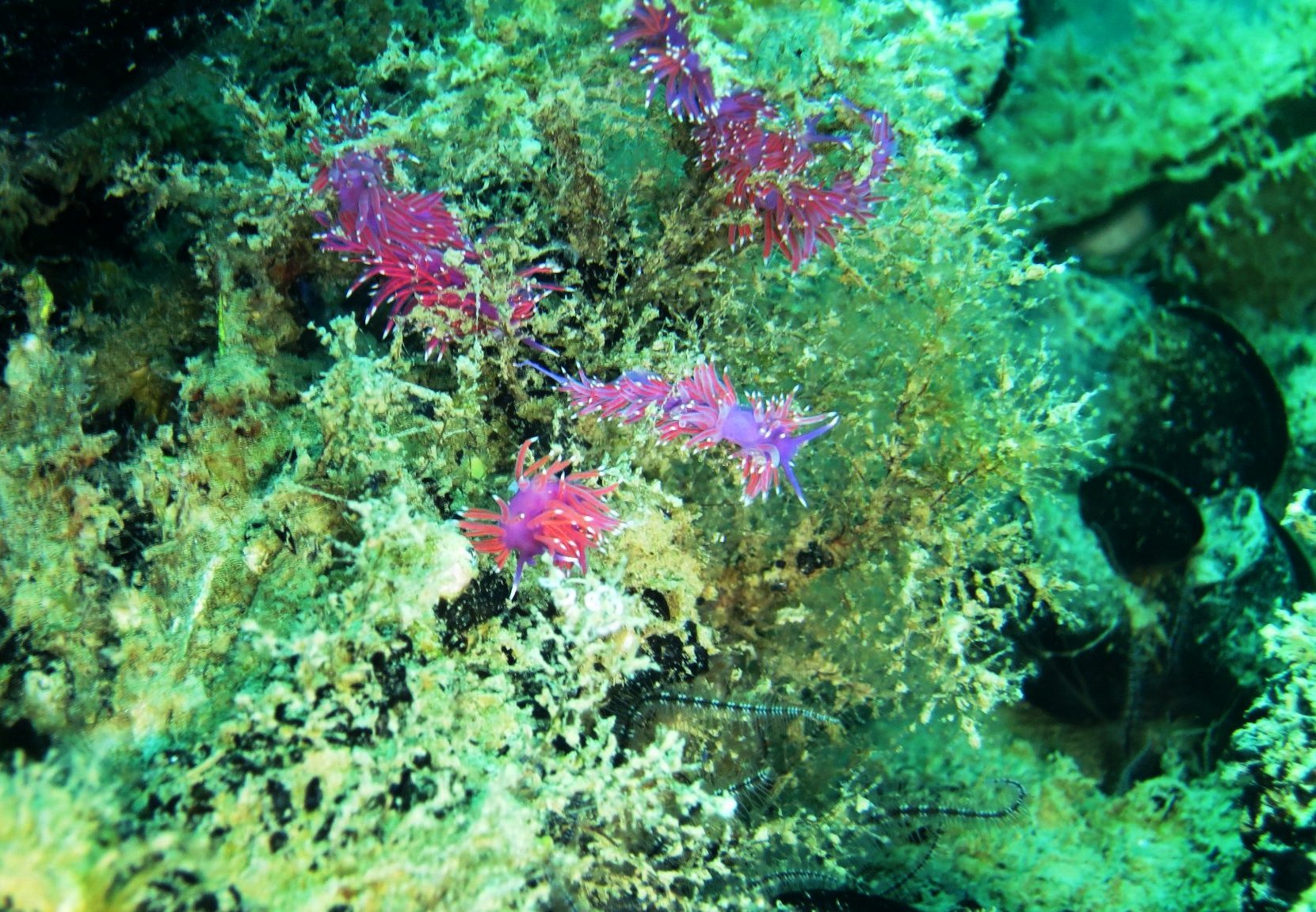 Resto ancora per qualche minuto ad indugiare sopra la prua, il tempo di ammirare un’alga alla quale sono aggrappate decine di minuscole flabelline, un nudibranco dallo sgargiante colore violetto lungo un paio di centimetri. Sono trascorsi una quarantina di minuti, un tempo ragionevole per la mia prima immersione dell’anno con una piccola bombola da 10 litri sulle spalle e senza nessun allenamento. Vedo che anche i miei compagni stanno risalendo. Risalgo lentamente dai 10 metri fino a 3 e mi sforzo di rimanere in assetto orizzontale come se dovessi fare la sosta di decompressione, ma ovviamente non ce né alcun bisogno. E’ la prima immersione in curva NDL che faccio dopo oltre un anno. Fare un po’ di esercizio è comunque sempre utile.