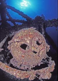 Saliamo a bordo in 19 subacquei con tutta la nostra attrezzatura e, oltre a noi, ci sono anche 4 guide e 1 pilota, ma lo spazio sul gommone è abbondantissimo e credo che potremmo tranquillamente imbarcare almeno un’altra dozzina di persone. Poco dopo le nove usciamo dal porto canale di Rimini e ci dirigiamo al largo con rotta verso nord. Il mare è calmissimo, nel cielo c’è un bel sole e la temperatura dell’aria sale rapidamente fino a toccare i 28-29 gradi. L’atmosfera a bordo è molto allegra e la musica diffusa dal potente stereo di cui è dotato il gommone la rende ancora migliore. Ma è soprattutto lo spirito delle guide romagnole che scherzano allegramente tra loro a trasmettere energia e voglia di divertirsi. Anche se non conosco nessuno a parte mia moglie e il mio amico Stefano di Pesaro mi sento perfettamente a mio agio. Dopo meno di 40 minuti di navigazione a “velocità di crociera” (...intorno ai 35 nodi!!) arriviamo sul nostro punto d’immersione, sulla verticale della piattaforma metanifera “Paguro”, che si trova una quindicina di miglia al largo di Marina di Ravenna. Ormeggiamo il gommone a una delle grosse boe assicurate al relitto e iniziamo tranquillamente a prepararci per la nostra immersione. Vengono formati quattro gruppi in base ai livelli di esperienza dei sub e verso le dieci saltiamo tutti in acqua. Angela ed io, assieme all’amico Stefano e ad altri due sub ci immergeremo con il “boss”, vale a dire con il simpaticissimo ed esperto Stefano (detto “Capt. Steve”), che è uno dei titolari del Dive Planet. Ci siamo! Alle 10:08 scendiamo in fila lungo la grossa cima che conduce alla parte più alta delle sovrastrutture del relitto e finalmente ha inizio la nostra immersione. |
