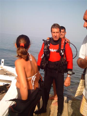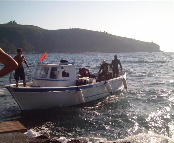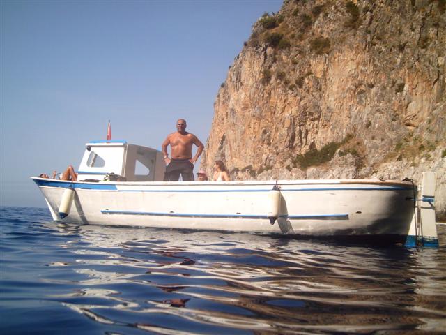 Arrivato al “Villaggio degli Olivi” il sabato pomeriggio, inizio subito la domenica mattina la mia settimana di immersioni. Mauro Cammardella, titolare dell’ottimo diving “Mauro Sub”, ospitato all’interno del villaggio, non si ricorda più di me e, dopo aver letto il mio curriculum, mi propone di fare un’immersione di assaggio all’esterno delle grotte, tanto per… controllare l’assetto. Non ho difficoltà ad accettare, dato che mi propone un tuffo in uno dei siti d’immersione più belli di Capo Palinuro: il cosiddetto “Pan di Zucchero”. E così, io ed Angela, assieme al simpatico Matteo, ci facciamo condurre da Mauro sino al punto di immersione in una giornata di sole e di mare calmo con un caldo assolutamente estivo.