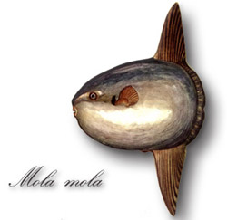 Il Pesce luna (Mola mola dal latino mola, "macina, mola" ) è il più grande tra i pesci ossei (gli squali sono infatti pesci cartilaginei). In inglese viene chiamato Sunfish, presumibilmente tanto per la sua forma, quanto per le sue dimensioni e per il fatto che durante le giornate di sole tende a salire alla superficie dell'acqua. Il Pesce luna abita il mare aperto, ma è localizzato prevalentemente lungo le acque costiere, vive in acque tropicali, temperate e fredde (spingendosi fino ai banchi di Terranova e lungo le coste norvegesi, occasionalmente anche nel Mar Baltico), Mediterraneo compreso. Nell'emisfero australe è diffuso intorno alle acque del Sudafrica e dell'Australia, ma non intorno alla Terra del fuoco.Questo pesce è caratterizzato da una forma allungata, ovaloide, molto compressa ai fianchi. La pinna caudale è formata da un'escrescenza carnosa (che parte dalla radice della pinna dorsale) che ha poca mobilità: la locomozione è affidata alle pinne dorsale e anale, opposte, simmetriche, robuste e allungate. La pinna dorsale è piccola e a ventaglio.I denti sono fusi tra loro nella piccola bocca e formano una sorta di becco. Le aperture branchiali sono ridotte ad un buco appena prima la pinna pettorale. La sua pelle può raggiungere lo spessore di 15 cm. Essa ospita fino a cinquanta specie di parassiti e microorganismi, i quali possono provocare il fenomeno della bioluminescenza. Il Pesce luna può raggiungere la lunghezza di tre metri per un'altezza di tre metri ed un peso di oltre due tonnellate. Si tratta inoltre di un pesce estremamente longevo: presumibilmente può superare ampiamente i cento anni di età. Quando il Pesce luna nuota in prossimità della superficie, visto da una barca, può esser confuso con uno squalo, dato che se ne vede soltanto una pinna.Come accennato, spesso risale alla superficie del mare dove fa galleggiare il corpo in posizione orizzontale. Pare che sia questa una maniera di liberarsi dei parassiti, che in questo modo possono venire mangiati dagli uccelli. Una femmina può deporre fino a trecento milioni di uova in una volta. Le larve hanno il diametro di appena due o tre millimetri.Il Pesce luna si nutre di plancton, di piccoli pesci e di meduse. |