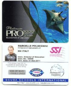 Sinceramente io ero convinto che la card "Platinum Pro" fosse concessa solamente ai subacquei con al loro attivo almeno 5.000 immersioni regolarmente registrate, ai professionisti della subacquea insomma. Ed ero assolutamente convinto di non meritare questo prestigioso riconoscimento, dato che pur avendo fatto centinaia di immersioni ero assolutamente lontano da quella cifra astronomica. Così, pur partecipando all’EUDI come ogni anno, non salii sul palco a ritirare il premio. Questo creò una specie di incidente diplomatico con SSI Italia, rischiando di incrinare l’amicizia con il suo numero uno Stefano Stolfa che conosco da tanti anni. In seguito Stefano mi spiegò che il regolamento della "Platinum Pro" card prevede che la sua concessione (proposta per iscritto da almeno due "Platinum Pros") spetti non soltanto a coloro che hanno fatto 5.000 immersioni, ma anche a chi possa documentare "a significant contribution to the recreational scuba diving industry". Ebbene, secondo Stefano i miei libri e il sito Marpola.it documentavano sicuramente un mio significativo contributo allo sviluppo della subacquea ricreativa. Così, a distanza di un anno, mi resi conto della tremenda gaffe fatta, e finalmente a febbraio di quest’anno sono salito sul palco dell’EUDI di Milano a ritirare il mio riconoscimento davanti a una platea di centinaia di subacquei e di appassionati che mi applaudivano calorosamente. |