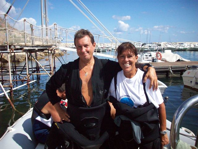 | Sopra: Angela e Marcello sul gommone prima dell'immersione sul "KENT" |
