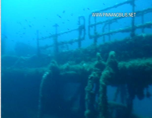 Dopo una breve perlustrazione della stiva, ci dirigiamo verso il cassero di poppa e precisamente sul lato di sinistra. Alla base del cassero si apre una piccola porticina che da su un corridoio che si affaccia su vari locali completamente spogli. Il lato di questo camminatoio che da verso poppa è pieno di finestroni e dopo essere entrati nel corridoio sgusciamo fuori uno alla volta proprio da uno di questi finestroni e ci dirigiamo verso la poppa estrema della nave. Ci affacciamo sulla murata di dritta e siamo contornati da sciami di castagnole nere e rosa. guardando in basso riusciamo a distinguere benissimo la grossa ammaccatura sulla fiancata generata dal violento impatto della nave con il fondale avvenuto al momento del naufragio. Proseguiamo quindi verso il ponte superiore e ci affacciamo all’interno di un locale completamente spoglio ma con varie lamiere collassate che sconsigliano una più lunga penetrazione all’interno. Do un'occhiata al computer e mi accorgo che siamo in leggero ritardo rispetto al nostro piano di immersione, dato che Manuel e Francesco si attardano un poco a curiosare inutilmente dentro a questo locale vuoto. All'interno si vedono soltanto alcuni piccoli gamberi rossi che con il loro vivace colore contrastano con il giallo/arancio delle lamiere arrugginite. Avverto Peppe del piccolo ritardo sulla nostra tabella e lui prontamente li richiama all’ordine. Poi, finalmente, riusciamo a compiere la nostra ultima penetrazione programmata: quella sul ponte di comando. Entriamo da una porta sul lato sinistro e usciamo da quella sul lato destro, dopo aver notato che il locale, caratterizzato da ampi finestroni sul davanti, è completamente spoglio e ciò che vi rimane è solo il basamento del timone o della bussola. Usciti sul lato di sinistra del ponte di comando, nuotiamo di nuovo verso la prua per dare una rapida occhiata alla grande ancora di rispetto addossata alla parete del cassero di prua, che si trova appena dopo la stiva prodiera. Nonostante la nostra scorta d'aria ce lo permetta, non c'è però più tempo per visitare la parte prodiera della nave e tantomeno per raggiungere i famosi container contenenti i Corani, che sono troppo distanti e richiedono un’immersione a parte. Siamo al 18° minuto d’immersione: la nostra tabella dice che il tempo di fondo è terminato ed è giunto purtroppo il momento di risalire. Perciò, sebbene a malincuore, ritorniamo al bigo di carico principale e da li alla cima di risalita e cominciamo lentamente la nostra ascesa, rispettando il piano decompressivo riportato sulle tabelle che portiamo sul polso. Riemergiamo felici di ciò che abbiamo visto dopo 43 minuti di immersione e sul gommone, di ritorno verso San Vito, commentiamo entusiasti quello che siamo riusciti a "catturare" di questa bellissima nave.