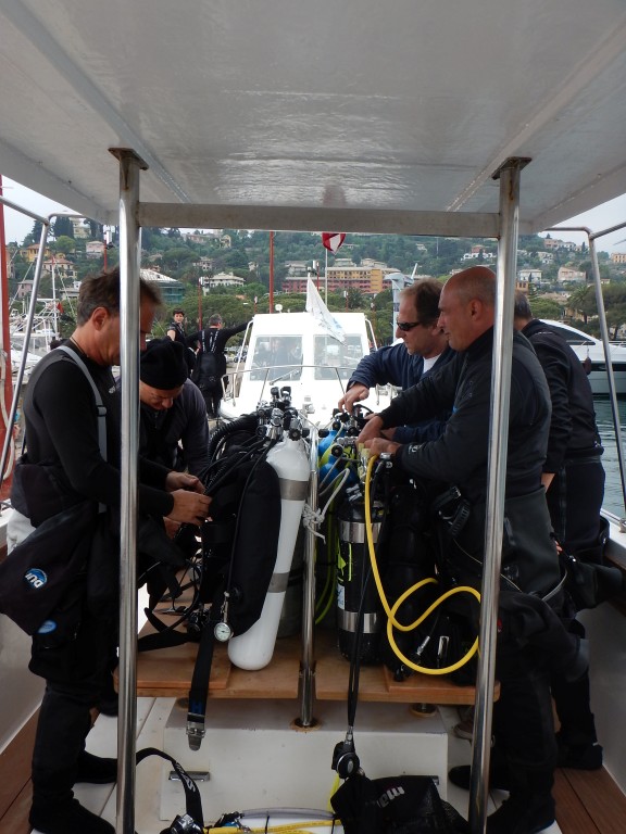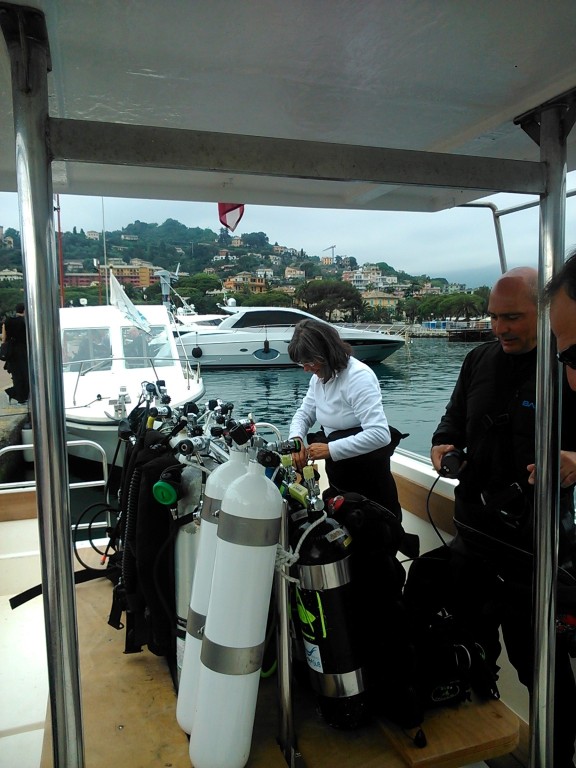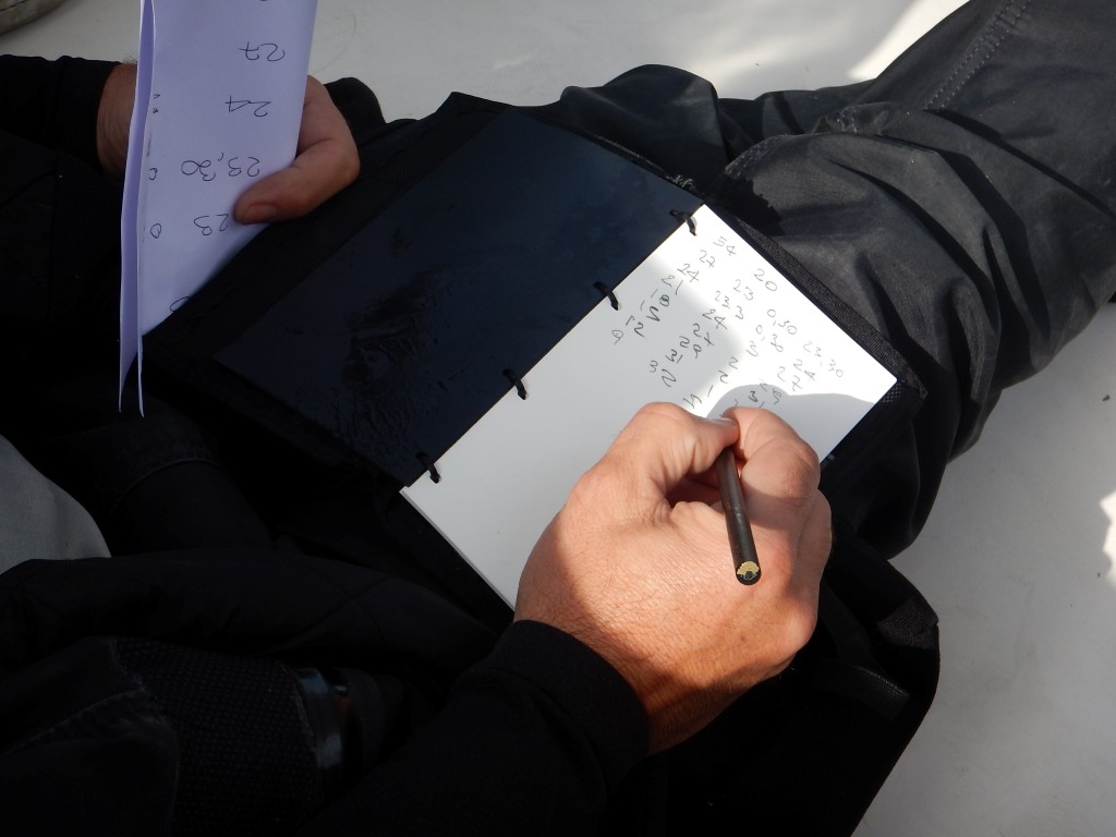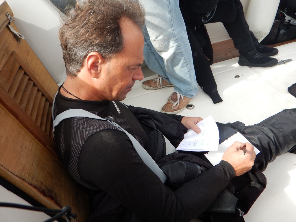 Si sistema l'attrezzatura sulla barca. In navigazione a 30 nodi verso Sestri Levante. Giorgio mentre riporta il piano decompressivo sul suo wet notes. |