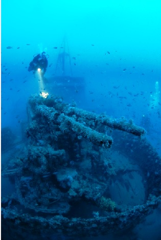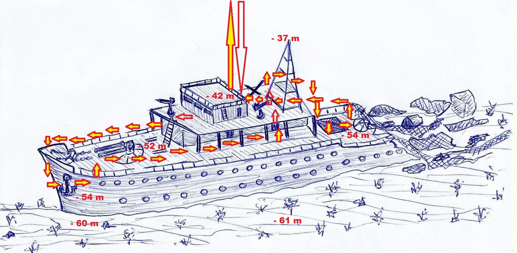 di Sestri Levante. Proseguendo verso poppa scorgiamo un piccolo tambuccio attraverso il quale si può scendere sotto coperta. Ai lati ci sono i resti dei sostegni di due mitragliere minori, con i loro depositi di munizioni. Ci dirigiamo verso poppa nuotando in fila indiana e passiamo attraverso la passeggiata di sinistra facendo attenzione a non sollevare sospensione. Mentre nuoto riesco a vedere qualche piccolo nudibranco e dei begli spirografi che chiudono il loro ciuffo al nostro passaggio.