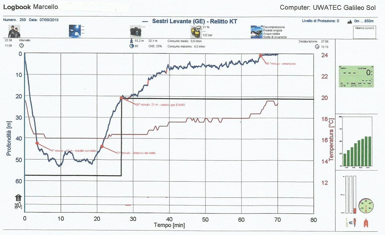 Il percorso della nostra immersione, il profilo scaricato dal mio computer e la tabella decompressiva utilizzata.