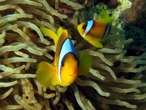 Giovedì 21 maggio. Il mattino seguente, l’immersione delle 7 avviene sulla punta Nord di Shaab Maksur. Trasportati come al solito dai gommoni, scendiamo sul plateau che si trova alla base del reef sui 25 metri, poi saltiamo oltre il drop off e arriviamo sui 47 metri di profondità, nuotando per circa 300 metri verso Sud tenendo la parete Ovest del reef alla nostra sinistra. Sotto di noi il fondale è piuttosto spoglio e manca il grosso pesce pelagico: vediamo solo piccoli branchi di tonni e di carangidi. Dopo una ventina di minuti d’immersione guadagniamo quota per smaltire la deco accumulata nel frattempo e ci teniamo sulla batimetrica dei 20 metri nuotando alla base del reef. Qui troviamo una corrente più forte, ma naturalmente c’è anche molta più vita di barriera e possiamo godere dei colori sgargianti di vari pesci. La vita di barriera è davvero esplosiva e non finirà mai di stupirmi ed emozionarmi. Branchi di coloratissimi pesci bandiera e tanti piccolissimi pesci di barriera bianchi e neri ci nuotano attorno e ci accompagnano durante la nostra sosta di sicurezza. Ci sono pesci farfalla, pesci balestra, gialli con sfumature verdi ed azzurre, pesci pappagallo, grugnitori, labridi e, tra gli anemoni, gli immancabili “pesci Nemo”, i pesci pagliaccio.