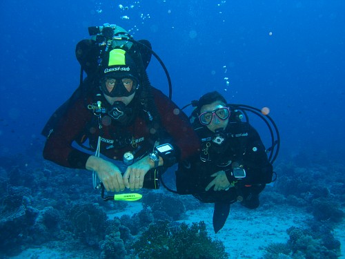 Ultimo giorno di immersioni, ancora due tuffi per salutare questo mare stupendo, portandomi dentro un’impronta forte e duratura. Dopo il consueto preciso breefing fatto da Chris, verso le 7 ci immergiamo sul piccolo reef sommerso di Abili Wadi Gimal. Ci tuffiamo dalla barca per un’immersione in nitrox molto tranquilla di circa un’ora, condotta senza mai superare i 20 metri di profondità e facciamo un paio di giri attorno al pinnacolo principale che arriva ad appena 5 metri dalla superficie del mare. Qui possiamo ammirare grandi branchi di ombrine gialle tropicali, pesci farfalla, pesci balestra, barracuda e una grande murena grigia affacciata dentro alla sua tana. Durante la nostra sosta di sicurezza finiamo la nostra immersione in bellezza, incontrando anche un piccolo squalo di barriera che nuota tranquillamente poco sotto di noi. Alle 11, dopo la solita abbondante colazione, facciamo il nostro ultimo tuffo di questa crociera sul reef di Abili El Radir, ormai in vista di Marsa Alam. Saltiamo giù dai due gommoni direttamente sulla punta Nord del reef, formato da una serie di pinnacoli madreporici semisommersi che si alzano dal fondale di sabbia bianca profondo appena 25 metri. Questo reef è molto colorato ed è tutto ricoperto di alcionari. Migliaia di delicati Anthias nuotano tra gli splendidi alcionari dai mille colori… uno scenario veramente unico! Incontriamo anche una grossa murena, pesci balestra, pesci scorpione e due grossi tonni che nuotano nel blu. Nuotiamo per un po’ tra i pinnacoli, raggiungendo la loro base, finché la corrente che viene da Sud ce lo permette, poi, dopo circa un’ora di immersione, spariamo in superficie i nostri pedagni per segnalare la nostra posizione ai marinai dei gommoni sempre attenti ai nostri spostamenti e ci facciamo recuperare ritornando senza fare fatica fino alla barca. Con un po’ di tristezza lanciamo un ultimo sguardo a questo meraviglioso Mar Rosso, che ci regala un tramonto dai colori bellissimi con il sole che proietta la sua luce radente dietro le colline a Nord Ovest di Marsa Alam. La natura di questo luogo è davvero affascinante. La sua vitalità prepotente e impetuosa, i colori intensi e sorprendenti dai contorni forti e decisi, le trasparenze inebrianti delle acque marine, la luce tagliente che abbaglia la vista, non possono lasciare indifferenti. Guardandosi attorno ovunque, con forza o con dolcezza, ogni cosa riesce a parlare a chi come me conserva ancora intatta la capacità di meravigliarsi dello spettacolo offerto dalla natura. Perso nei miei pensieri, saluto questo mare con gratitudine, stringendo forte il suo dono più bello: la mia collana di freschi ricordi. Ritornerò… devo assolutamente ritornare!!Sotto a sinistra gli amici del G.S.V. - Gruppo Subacqueo Vicentino e a destra il mitico "Gruppo Pulmino"... |