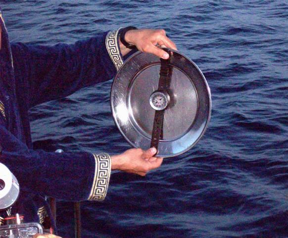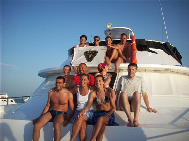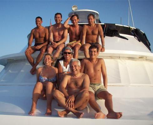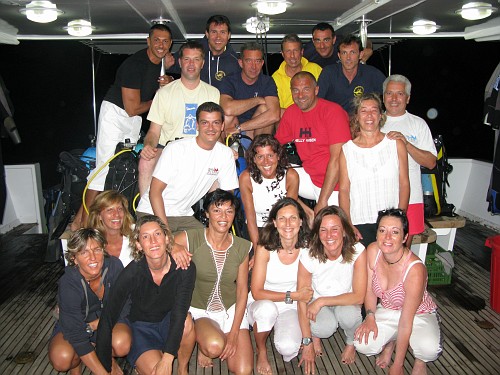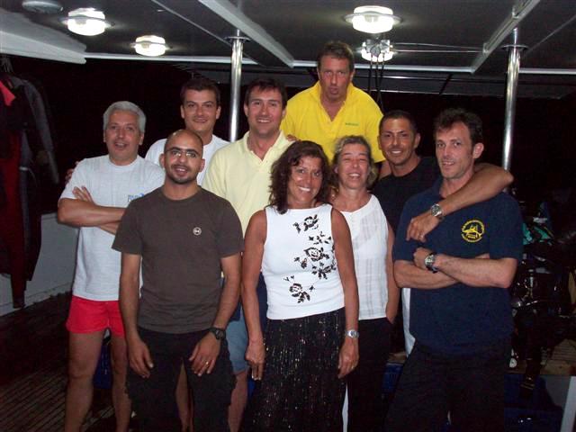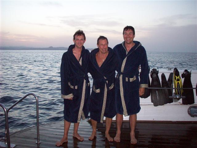 Il nostro gruppetto prosegue l’immersione e arriva a nuoto fin sotto alla barca, quando il sole sta ormai tramontando all’orizzonte. A questa latitudine il tramonto avviene molto presto. Dopo circa un quarto d’ora notiamo spuntare lontano dall’altra parte del reef prima uno e poi due pedagni… Sono gli amici del gruppo G.S.V. che… evidentemente hanno perso l’orientamento!! Subito parte uno dei gommoni per andarli a recuperare e poco dopo eccoli salire a bordo della “Princess Zeinab” muti e sconsolati, mentre il mio gruppo si diverte a prenderli in giro e improvvisa una simpatica cerimonia di consegna di una bussola su di un piatto d’argento tra le risate generali. Meno male che l’allegria a bordo non manca mai! A sinistra la consegna del trofeo "Bussola d'argento" al G.S.V. mentre sotto Silvano, Marcello e Germano che se la ridono di gusto... |